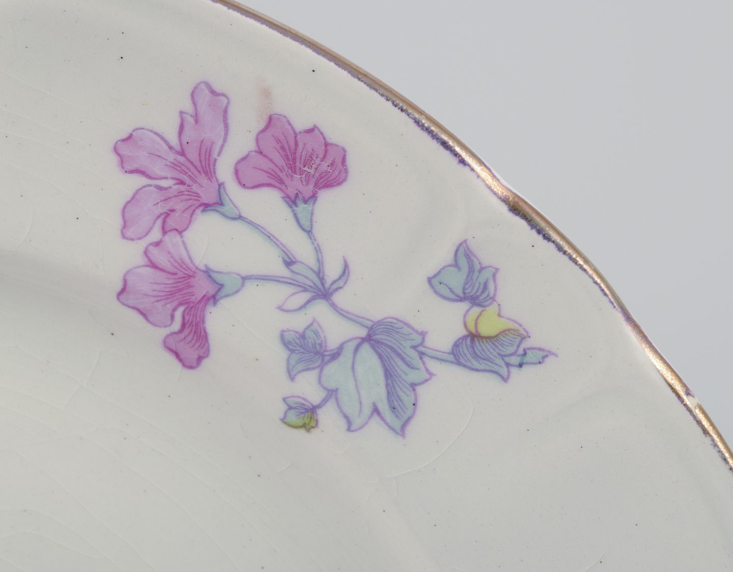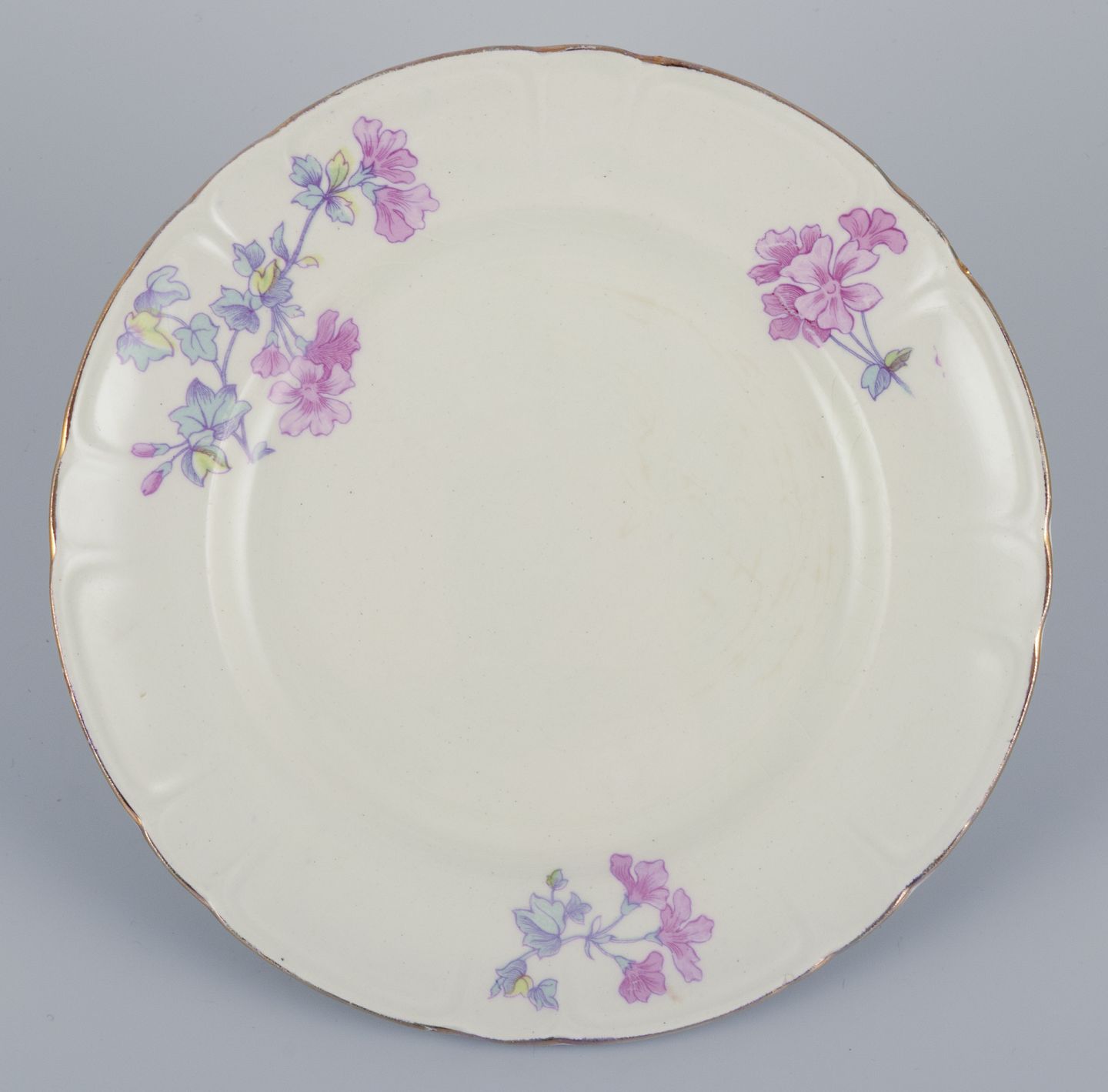 Et sæt på seks flade ”Geranium” tallerkener i fajance.
