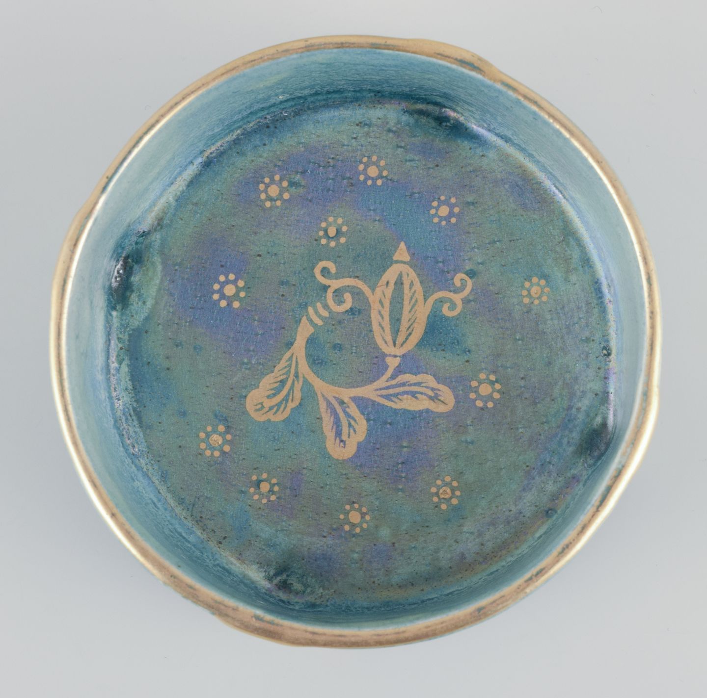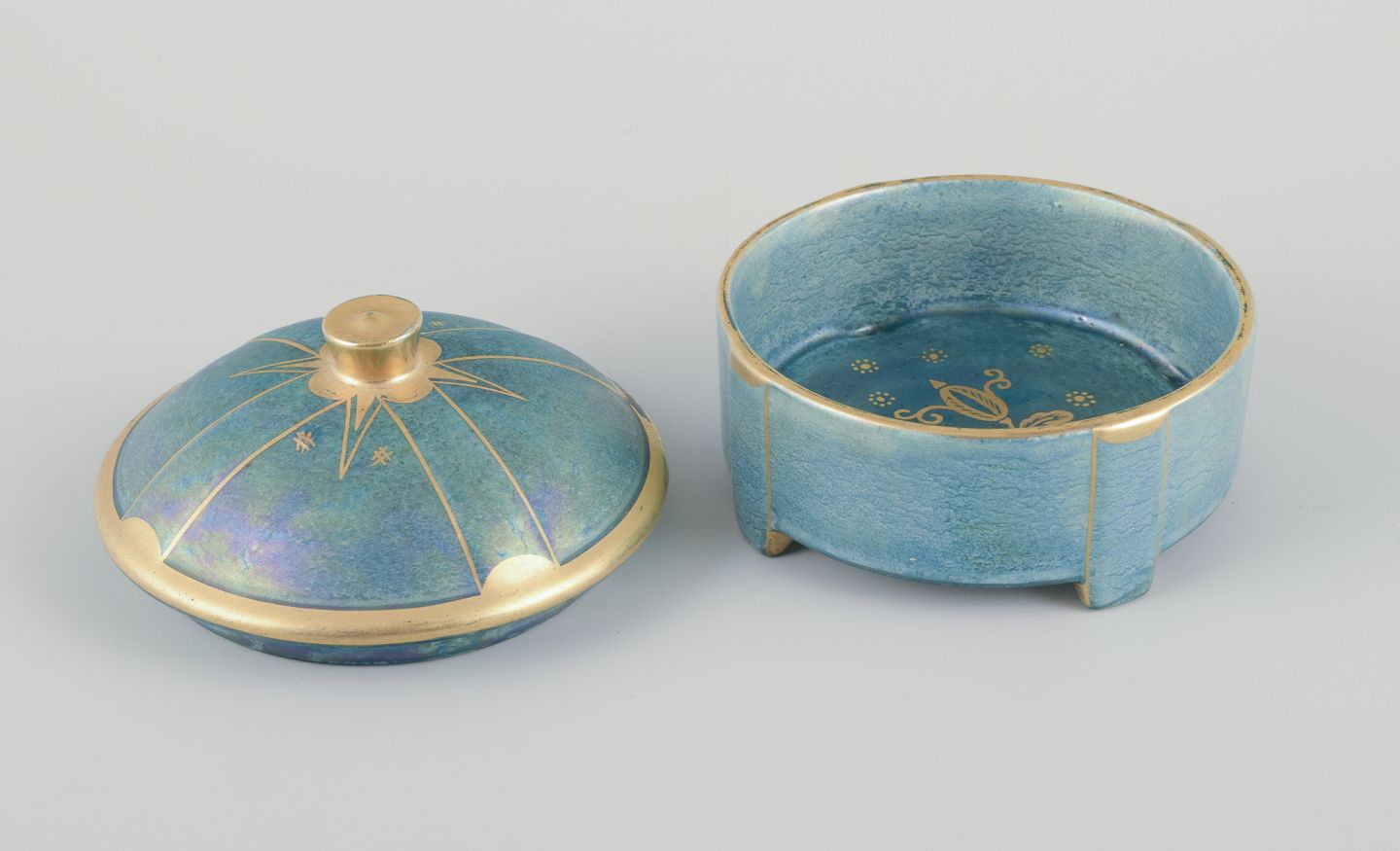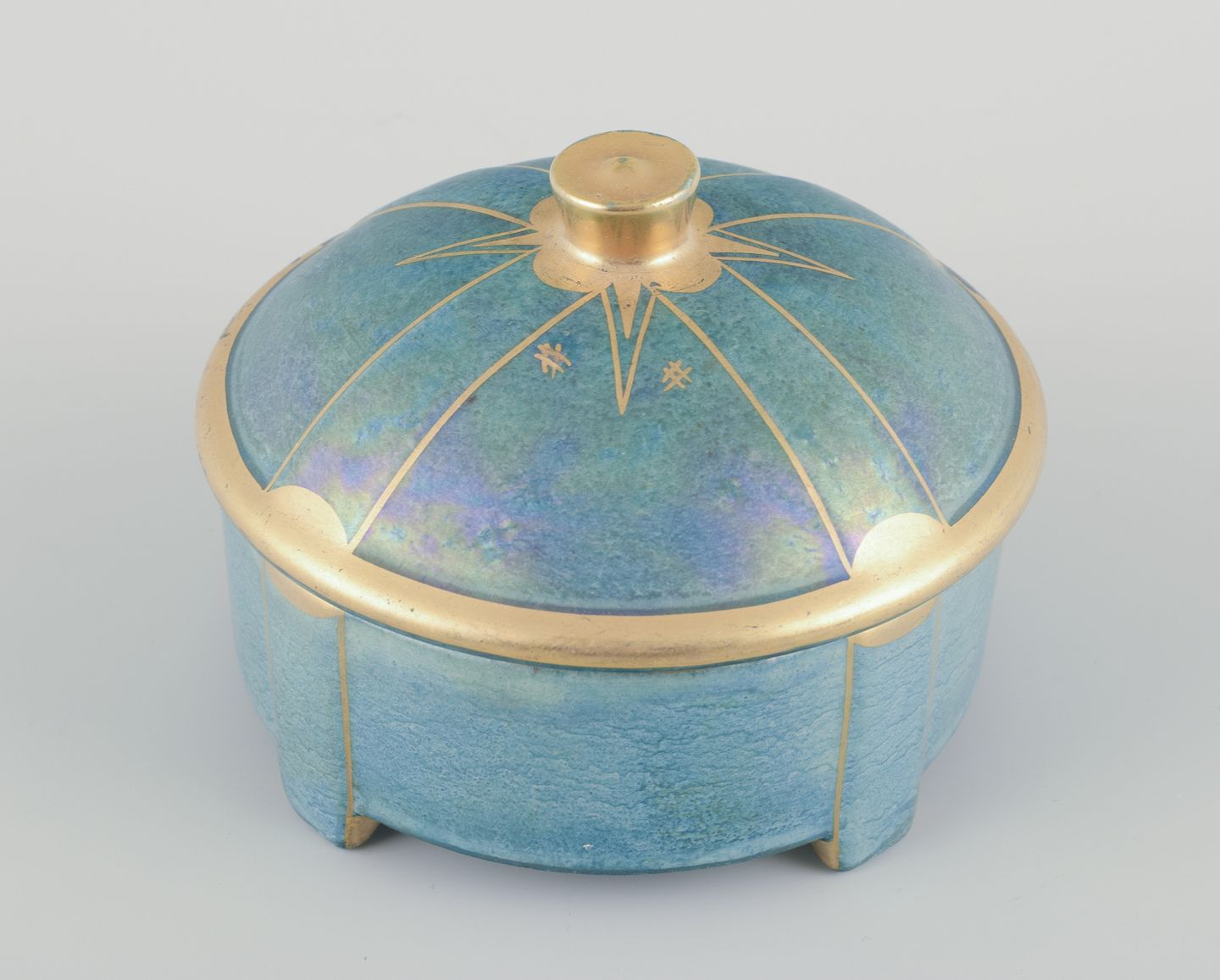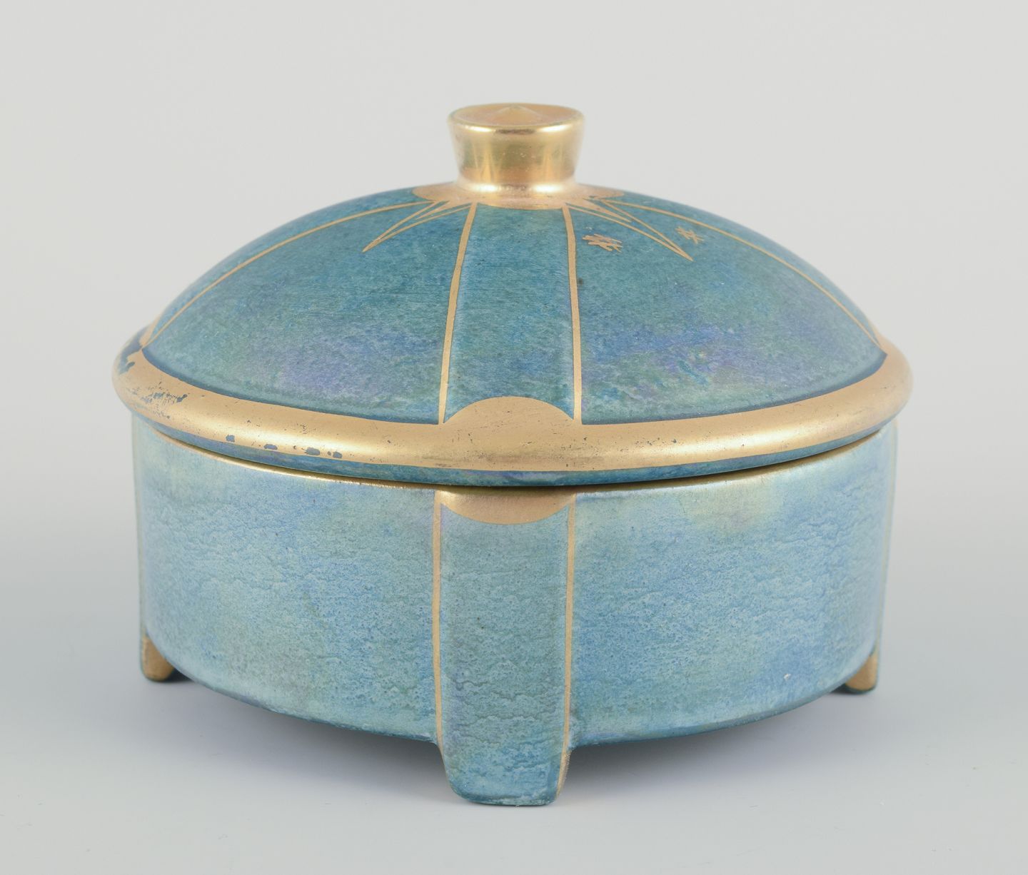 Bonbonniere i porcelæn. Håndmalet i lustreglasur, gulddekoration.