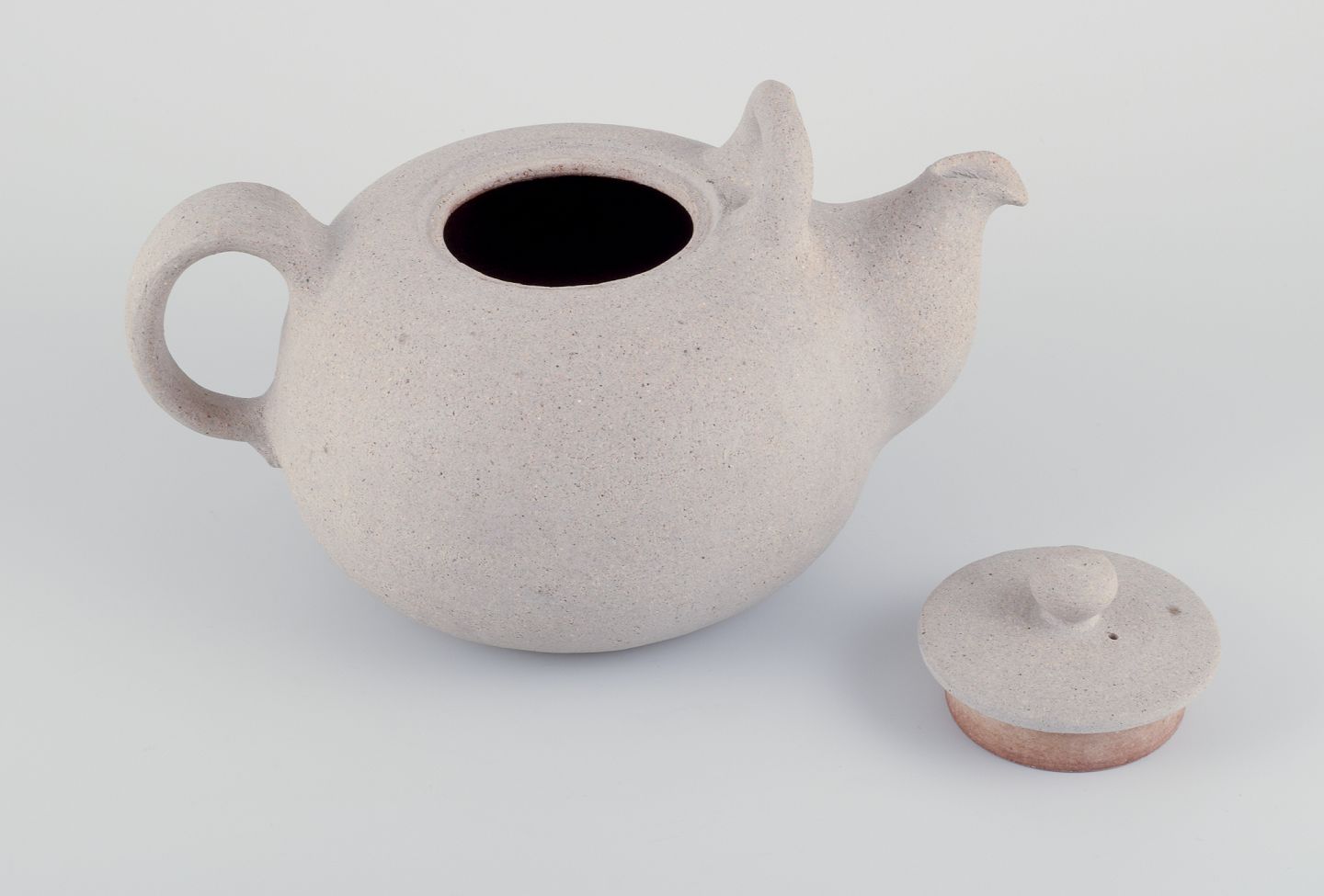 Nils Kähler (1906-1979) for Kähler. Stor tekande i uglaseret keramik. Sandfarvet. Ca. 1970. Signeret. I flot stand, med ubetydeligt lille skår i tuden. Se foto. Mål: B 34,0 cm. x H 17,0 cm.