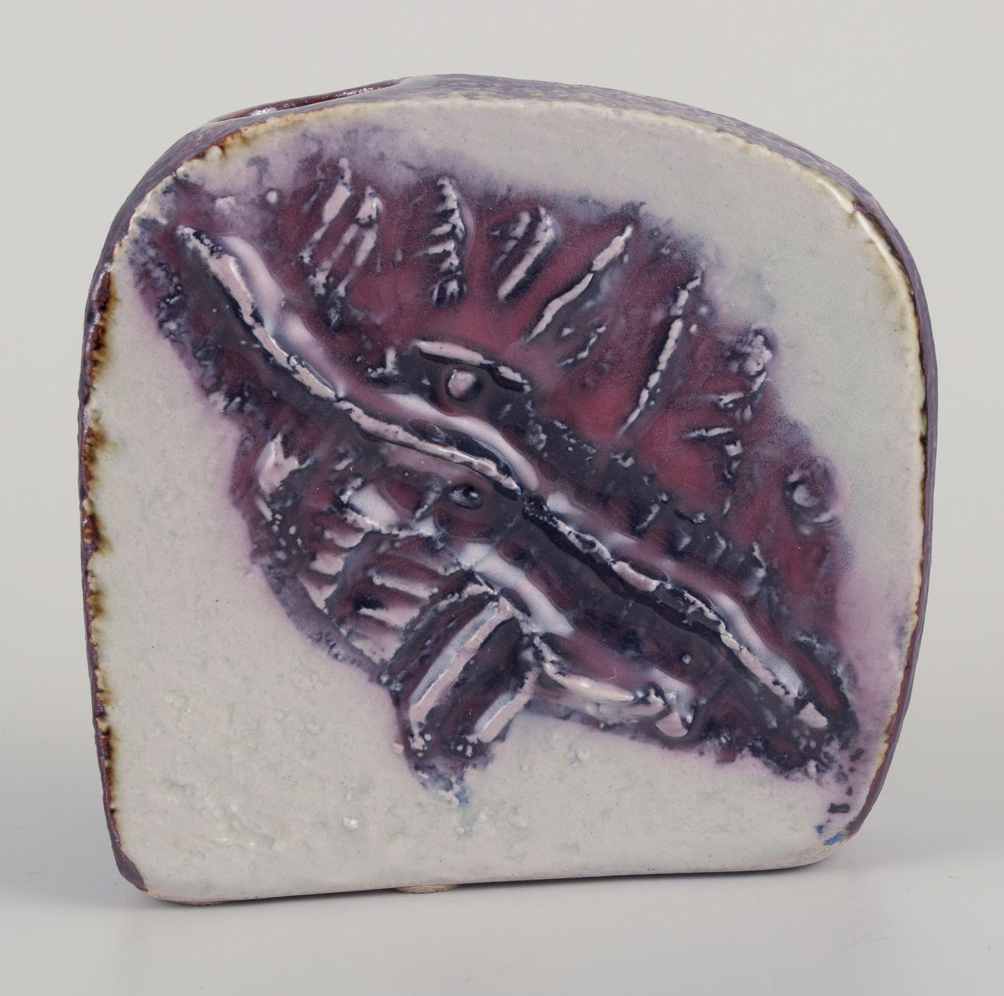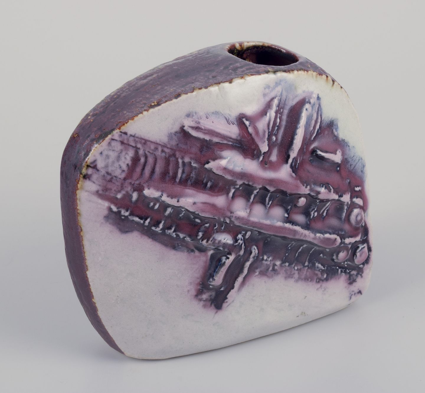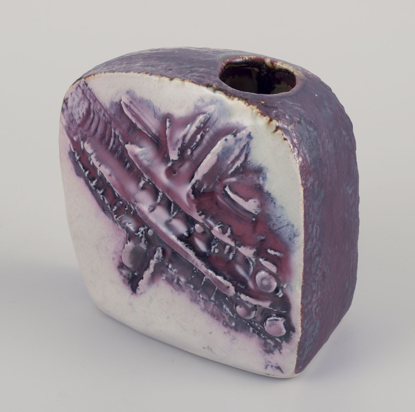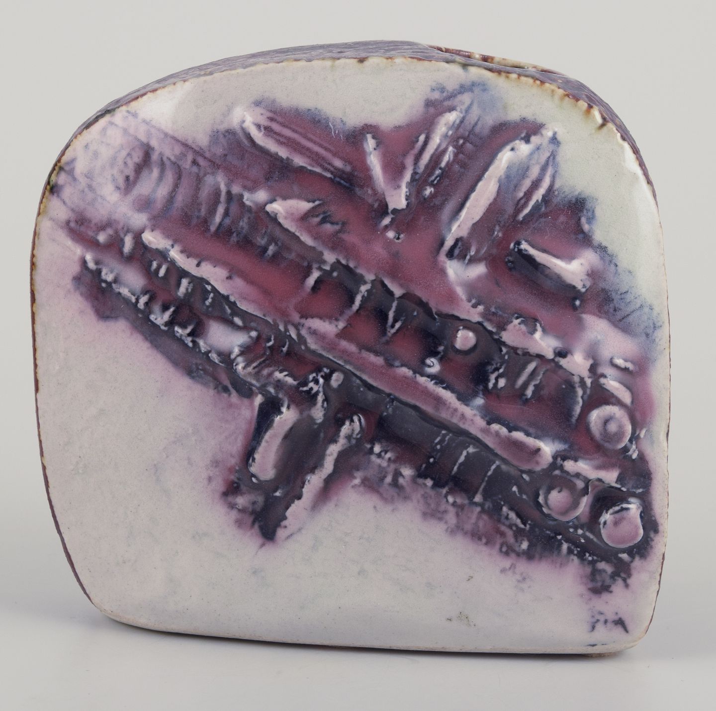 Unika vase af stentøj. Usædvanlig form. Abstrakt motiv i lilla nuancer i relief.