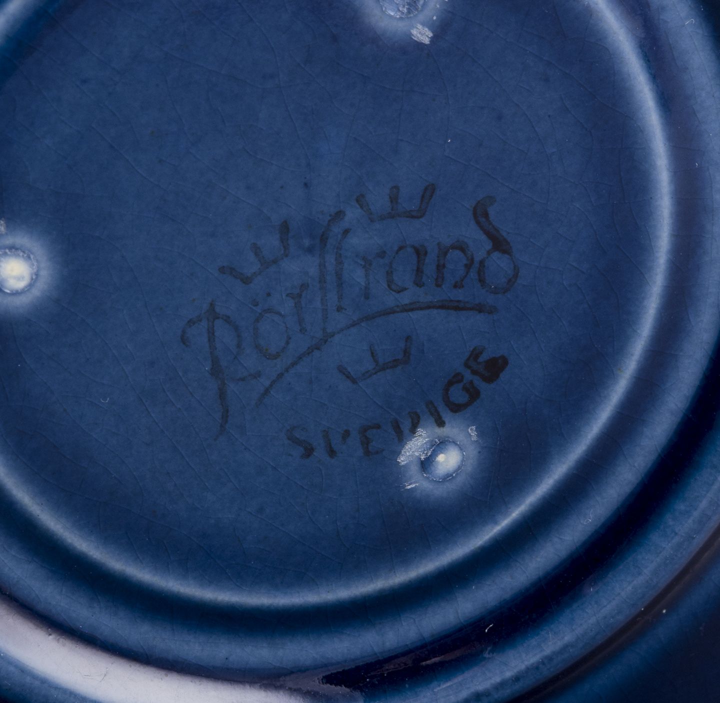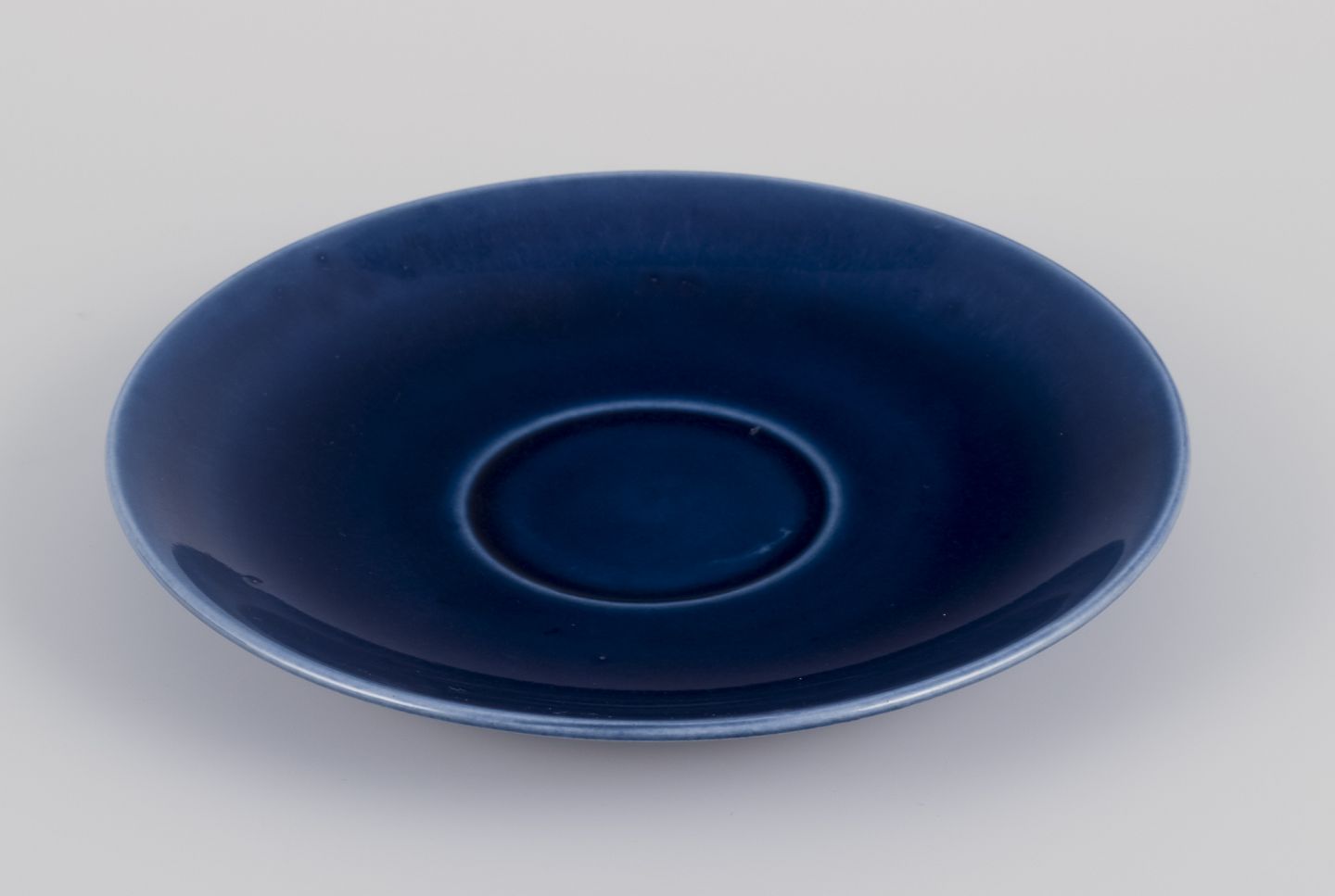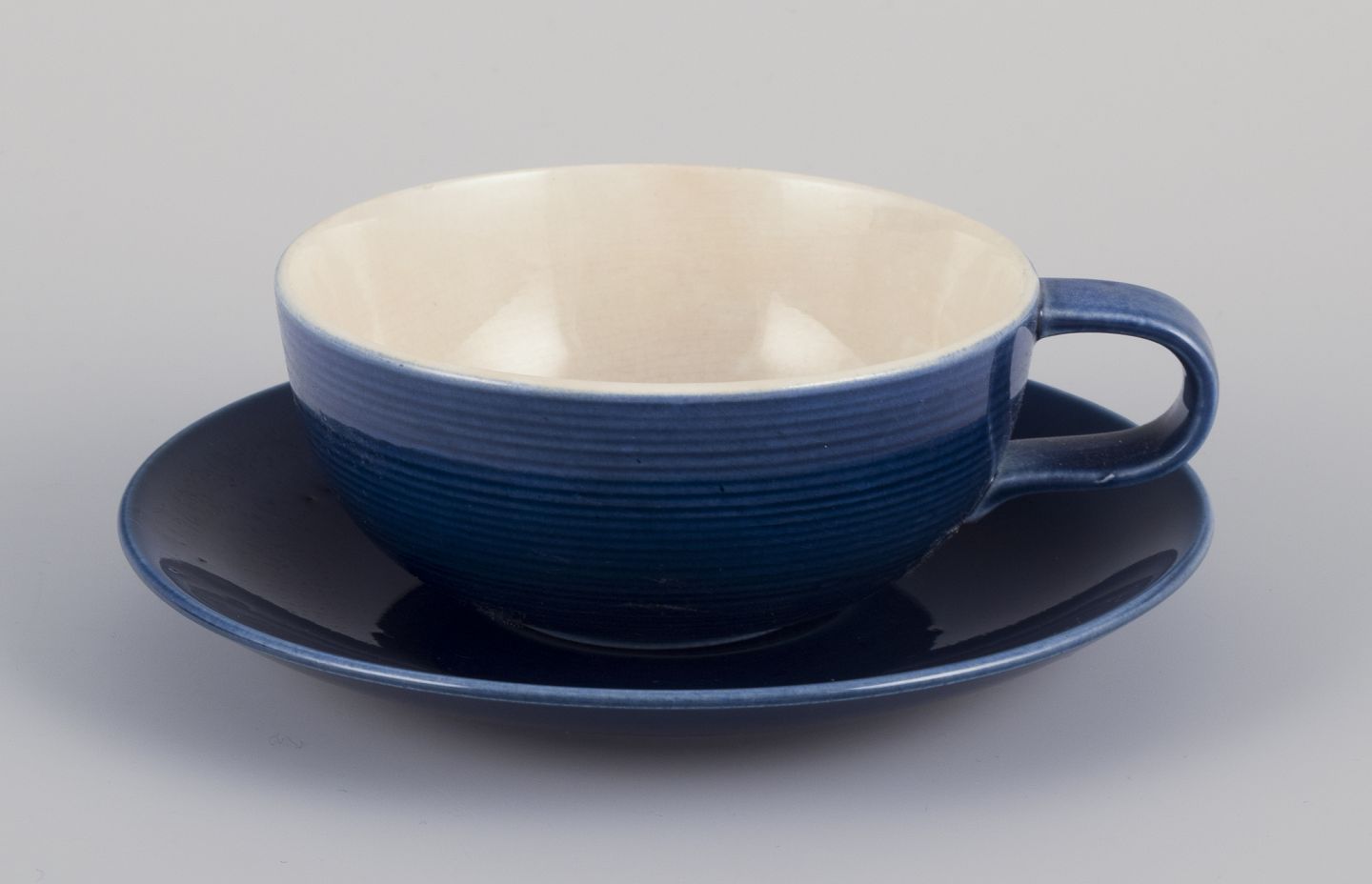Et sæt fire “Blå Blanche” tekopper med tilhørende underkopper i fajance.