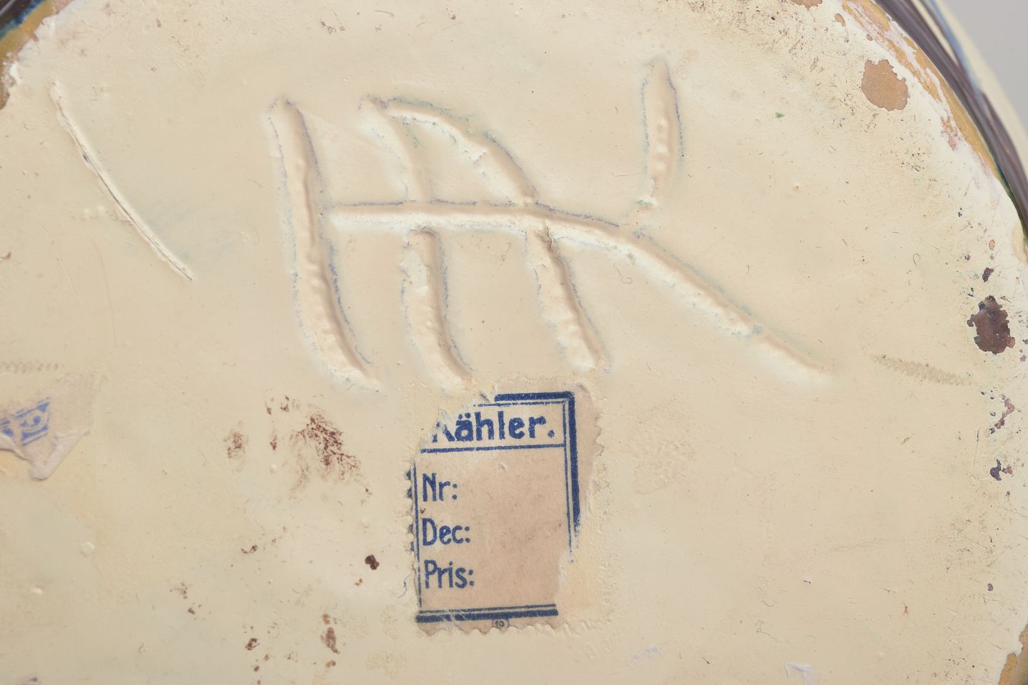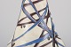 Kohornsdekoration i blå og brune nuancer på cremefarvet bund.