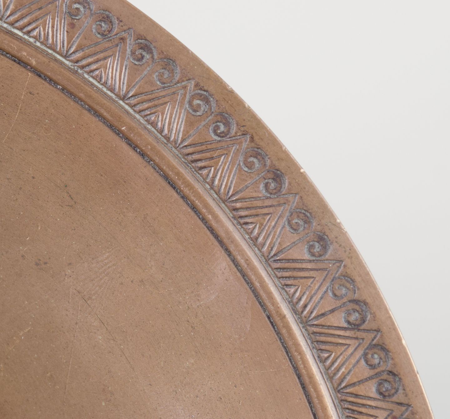 Cirkulær Art Deco skål af patineret bronze.