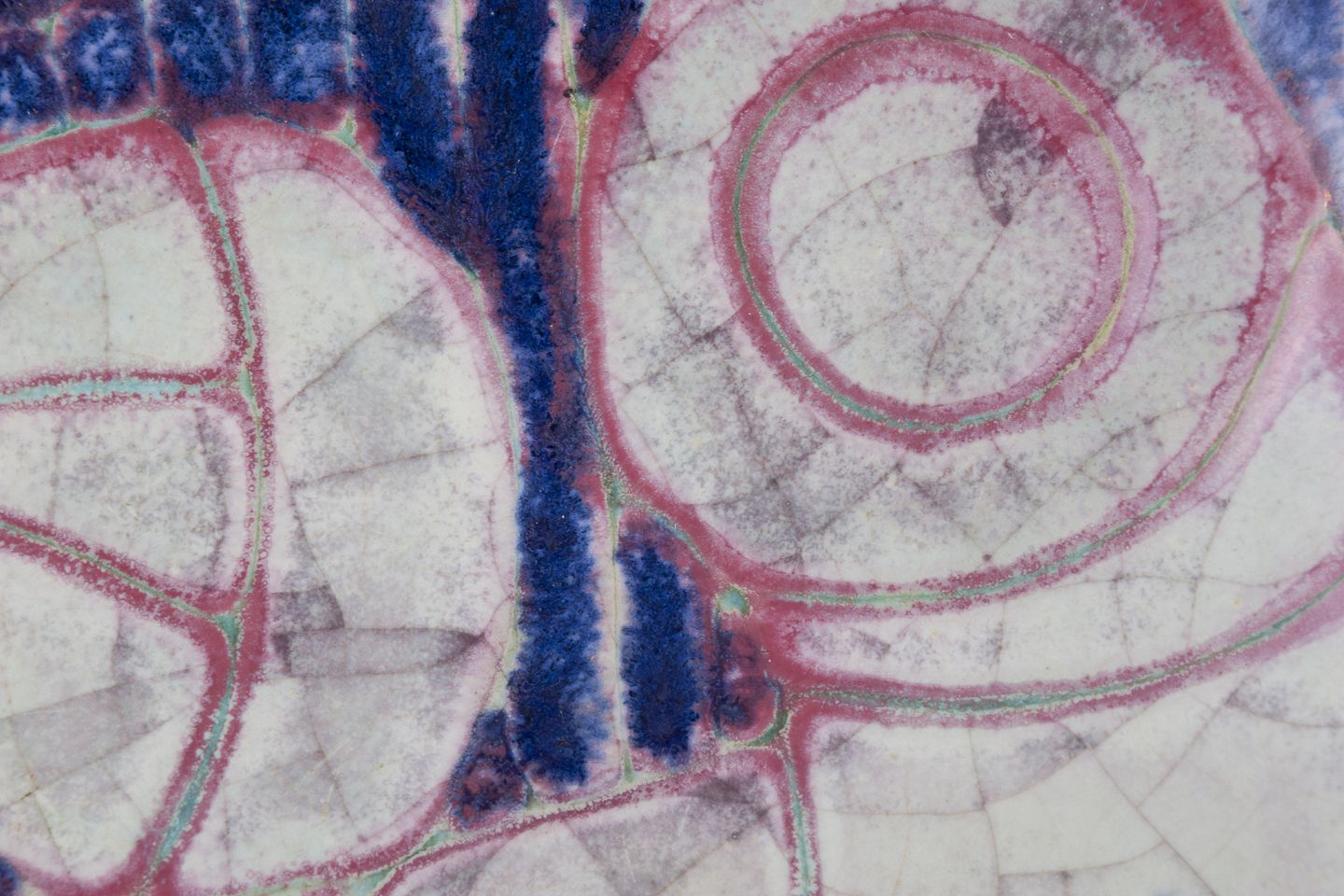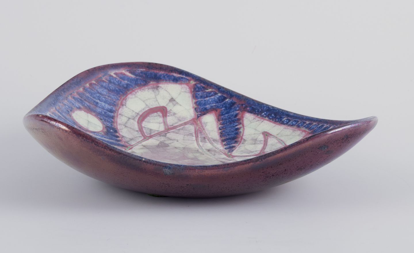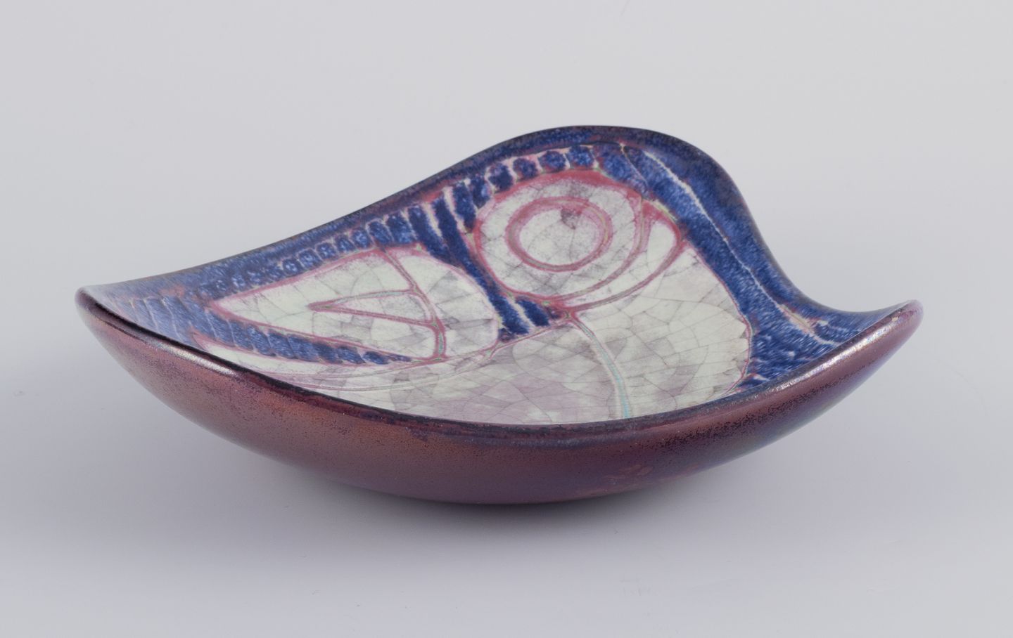 Michael Andersen, Bornholm. Håndglaseret keramikfad. Motiv af fugl. Glasur i blå, rødlige samt lyse toner. Ca. 1960. Stemplet. Perfekt stand. Mål: B 22,0 cm. x H 5,0 cm.
