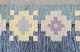 Vævet med geometriske felter i forskellige farver på blå og grøn bund.