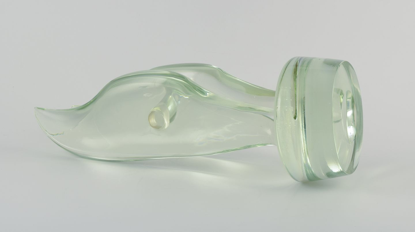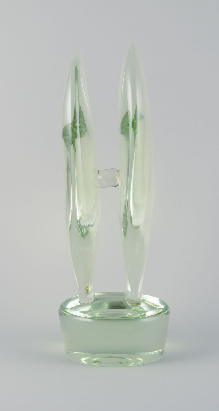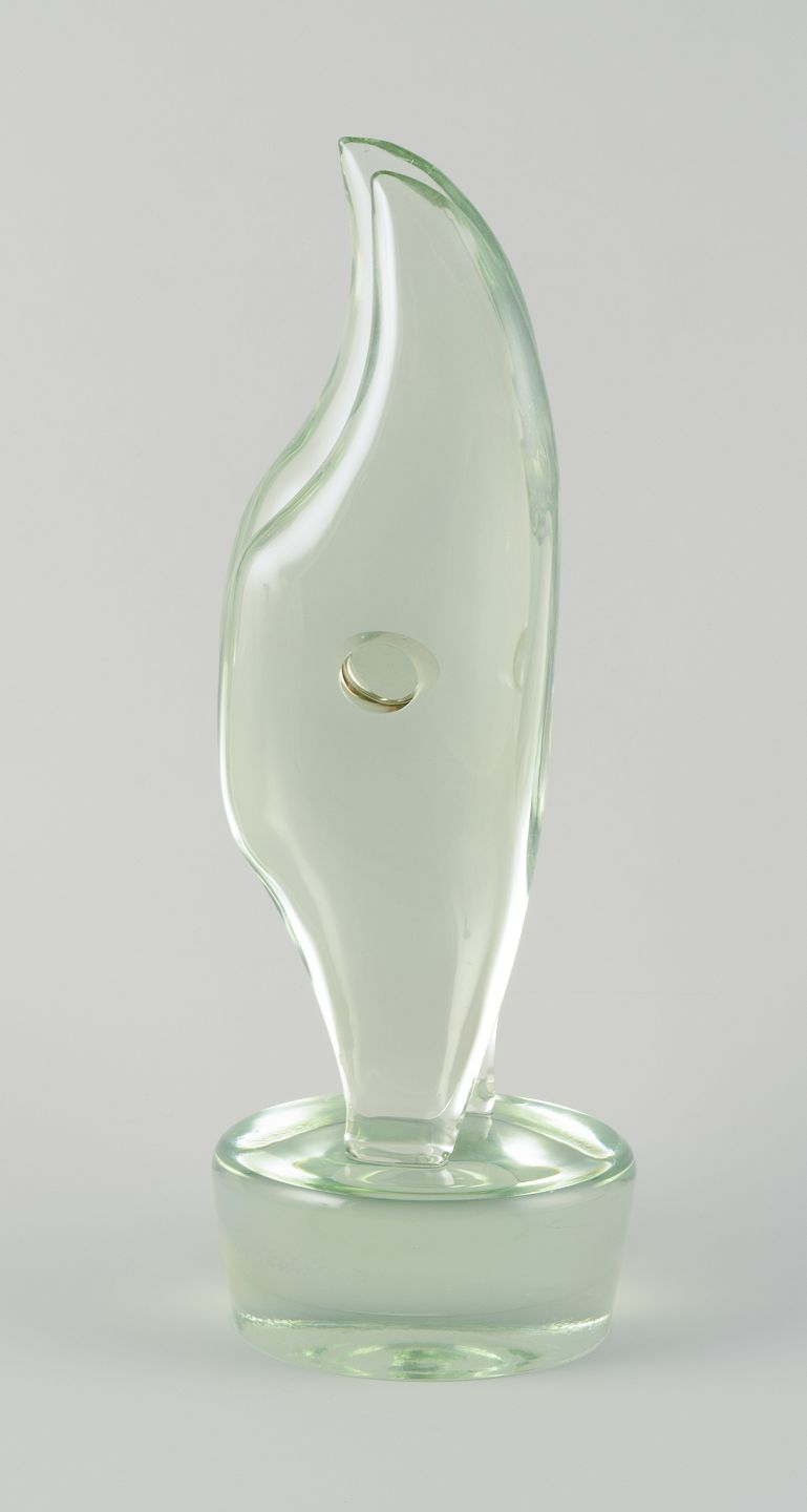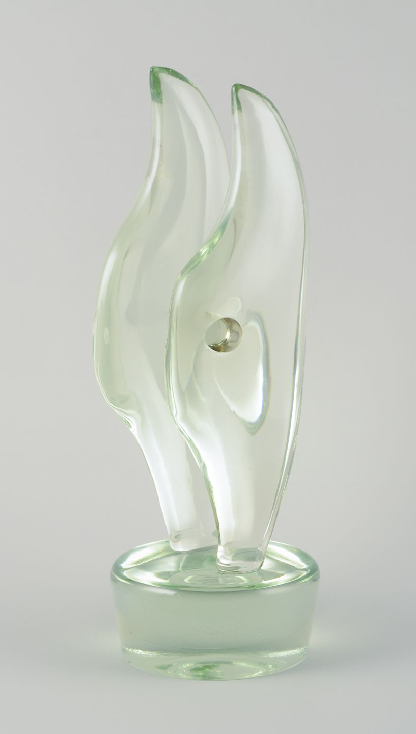 Stor skulptur af lysegrøn kunstglas. Organisk form, dobbeltvinge på sokkel. Mundblæst.