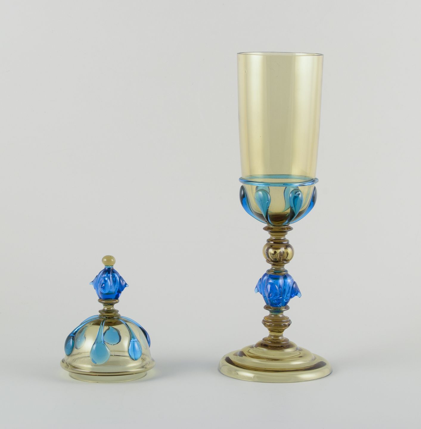 Murano, Italien. Stor pokal lågvase af blåt og røgfarvet kunstglas.