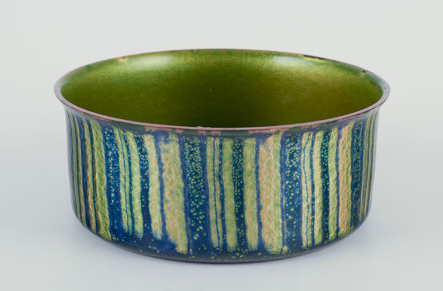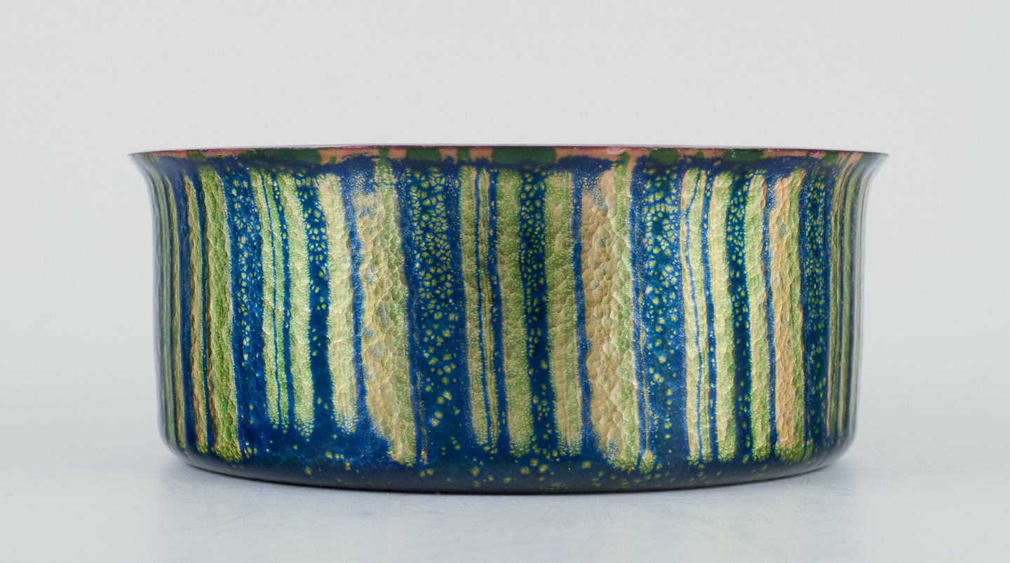 Norsk designer. Blank emaljeret kobberskål. Grønne og blå toner. Ca. 1970’erne. I god stand, små ubetydelige skår, se fotos. Mål: D 13,8 cm. x H 5,6 cm.
