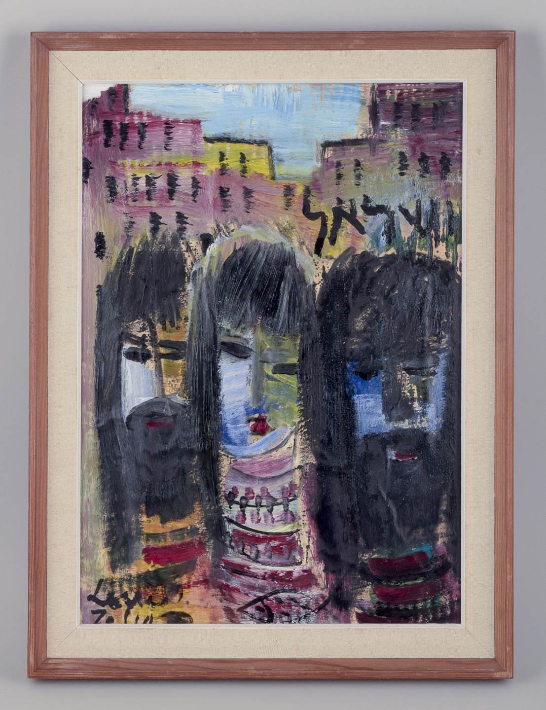 Bymotiv af tre personer i forgrunden.