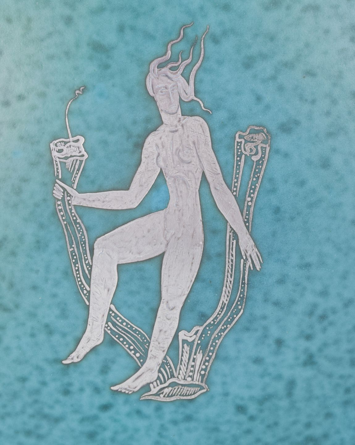 Motiv af nøgen kvinde, håndmalet i sølv.