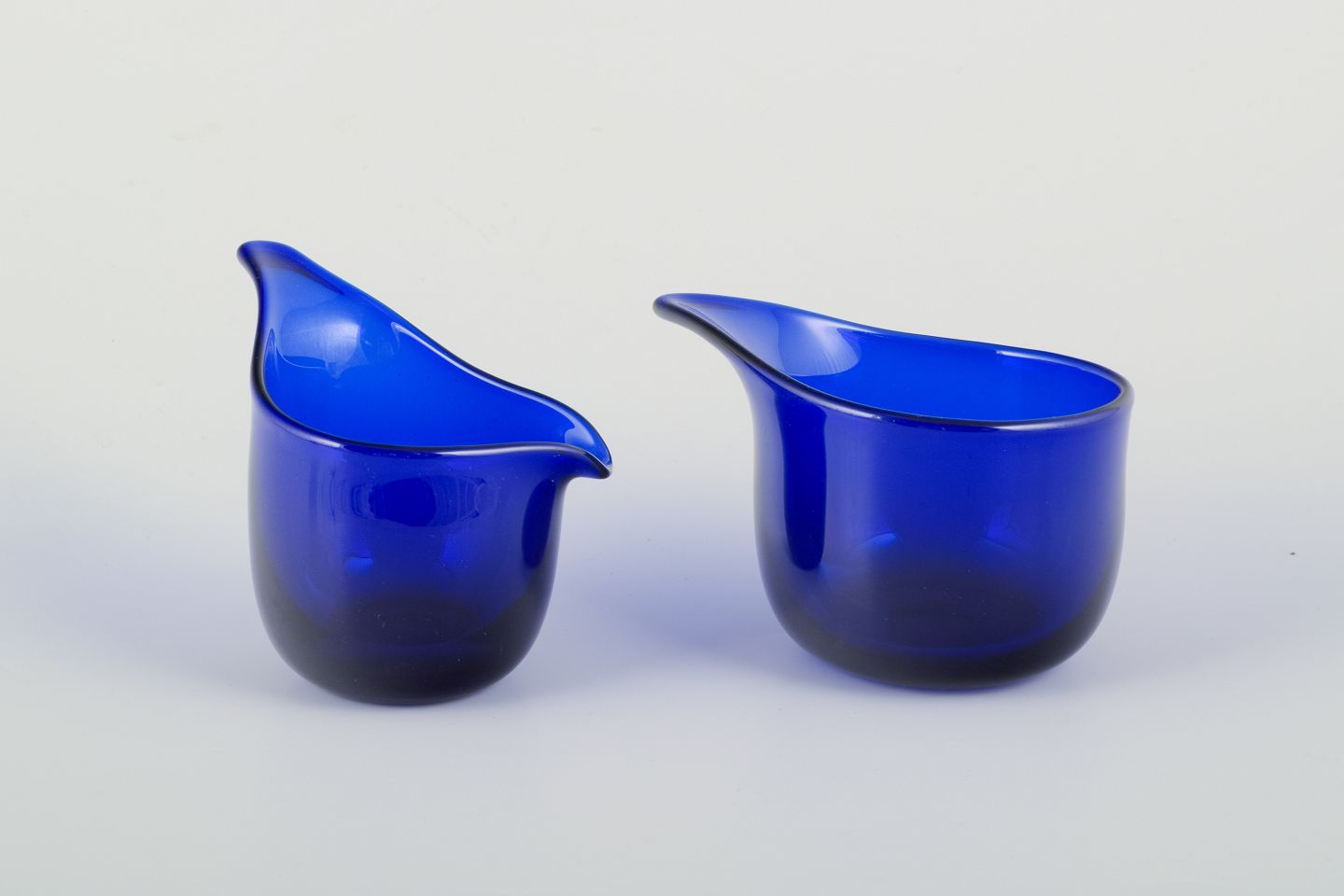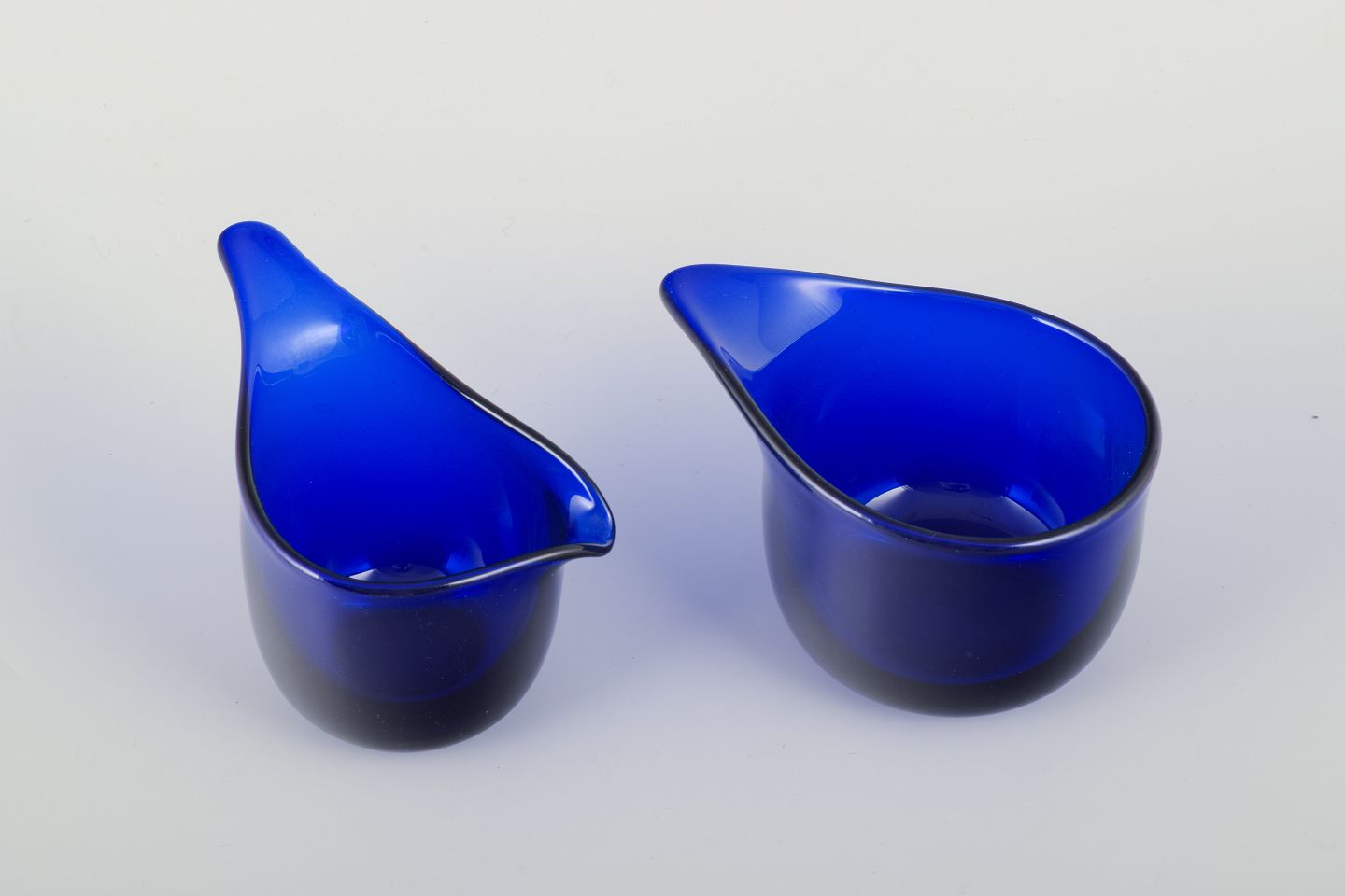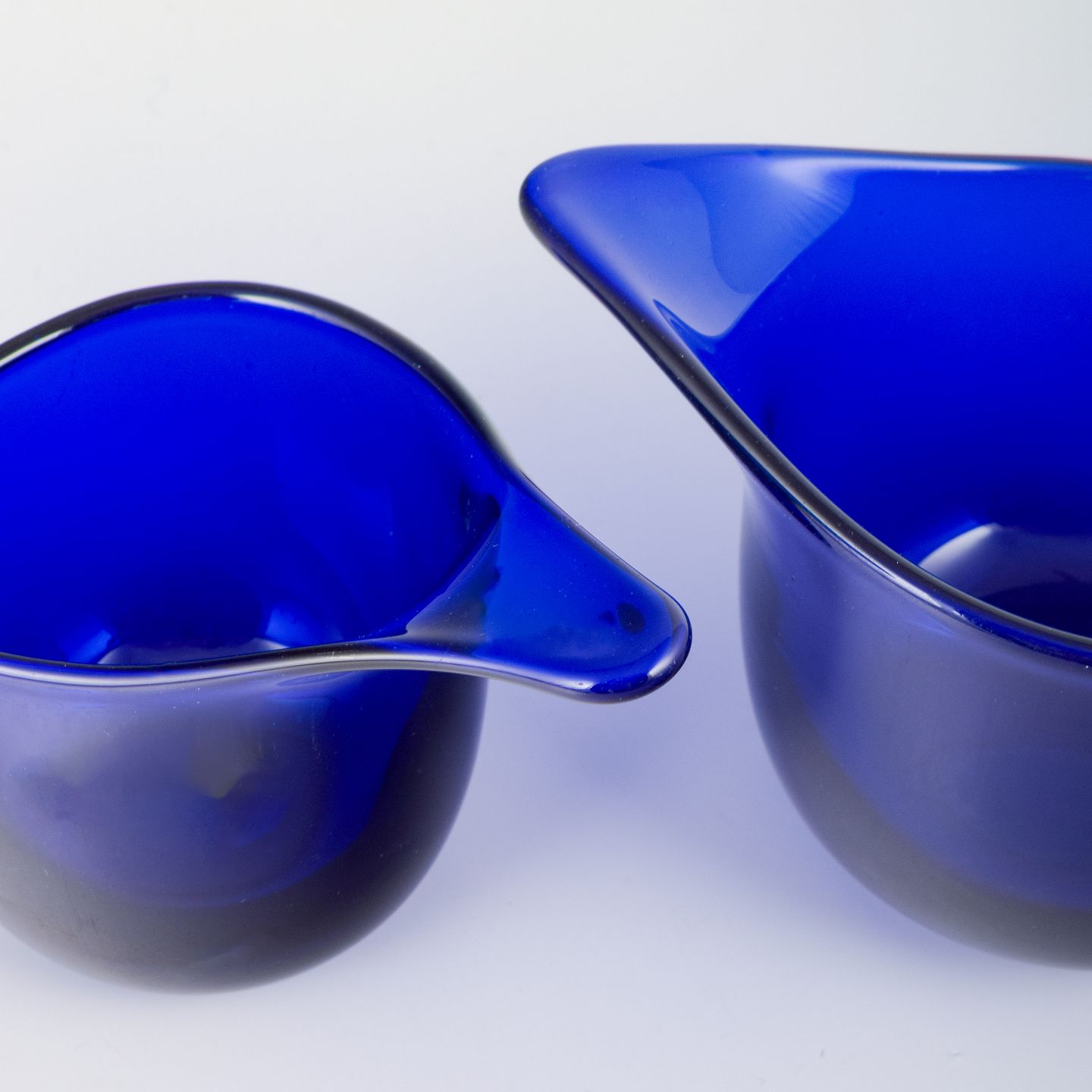 To små kander i koboltblåt glas fra Holmegaards serie Vipstjert, designet af Per Lütken, begge med karakteristisk hældetud og organisk form.