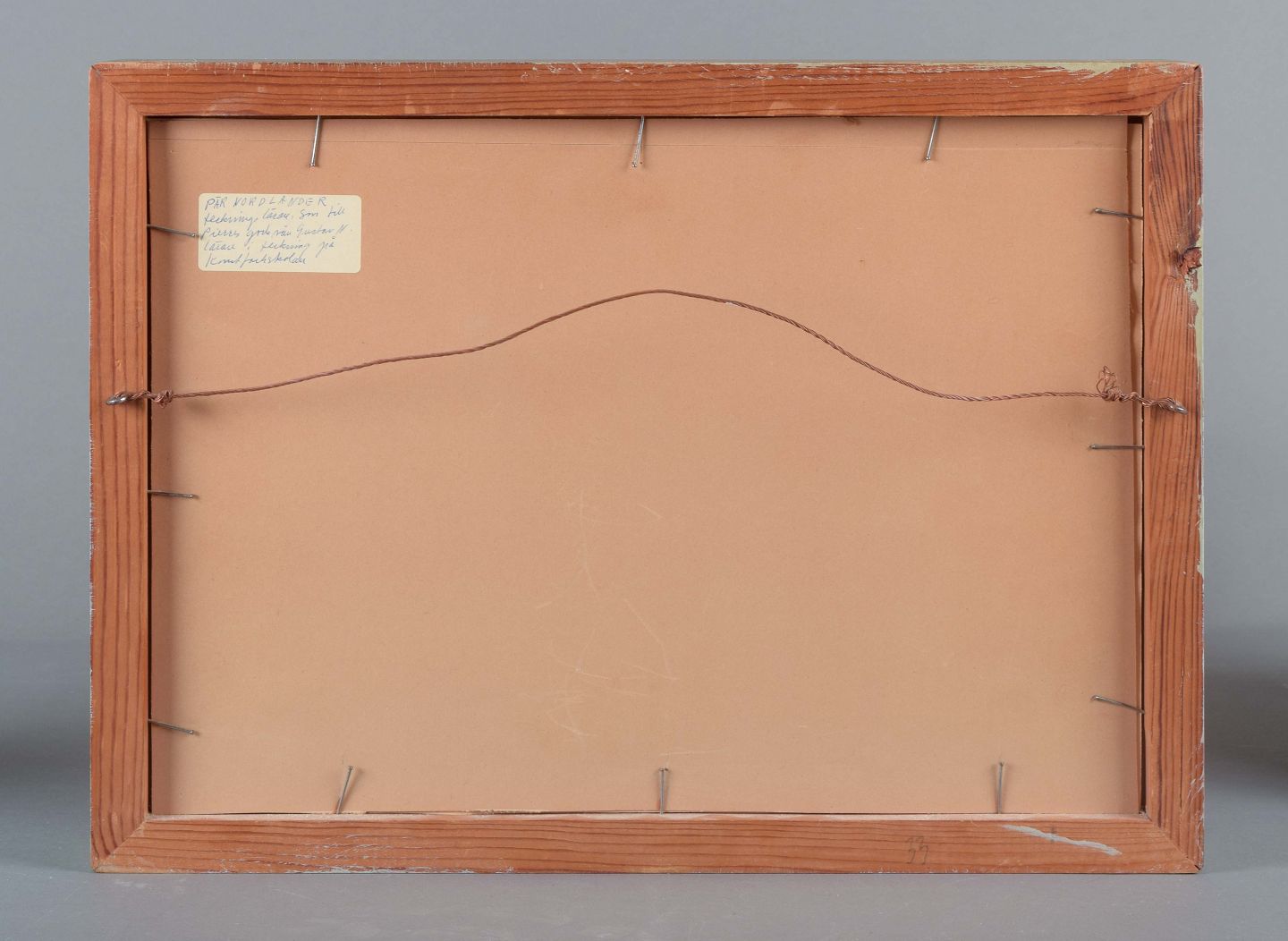Et karakteristisk værk af den svenske maler Pär Nordlander (1920–2001), udført i et modernistisk formsprog præget af kubistisk inspiration. Med rytmiske, geometriske former og en afdæmpet palet af jordfarver, kontrasteret af kølige blåtoner, fremmaner Nordlander en abstraheret vision af et kystnært bylandskab. Værket vidner om kunstnerens særlige evne til at forene stram komposition med en atmosfærisk koloristik, som har gjort hans by- og havnemotiver eftertragtede blandt samlere.