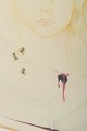Surrealistisk farveætsning af en kvindes ansigt, antydet med fine linjer og gyldne toner, fremstillet mod en foldet klædeflade. Kompositionen rummer tre hvepse samt en bloddråbe, der giver værket en symbolsk og urovækkende karakter.