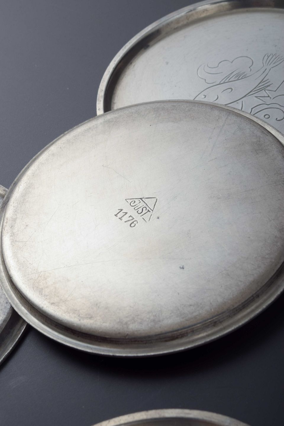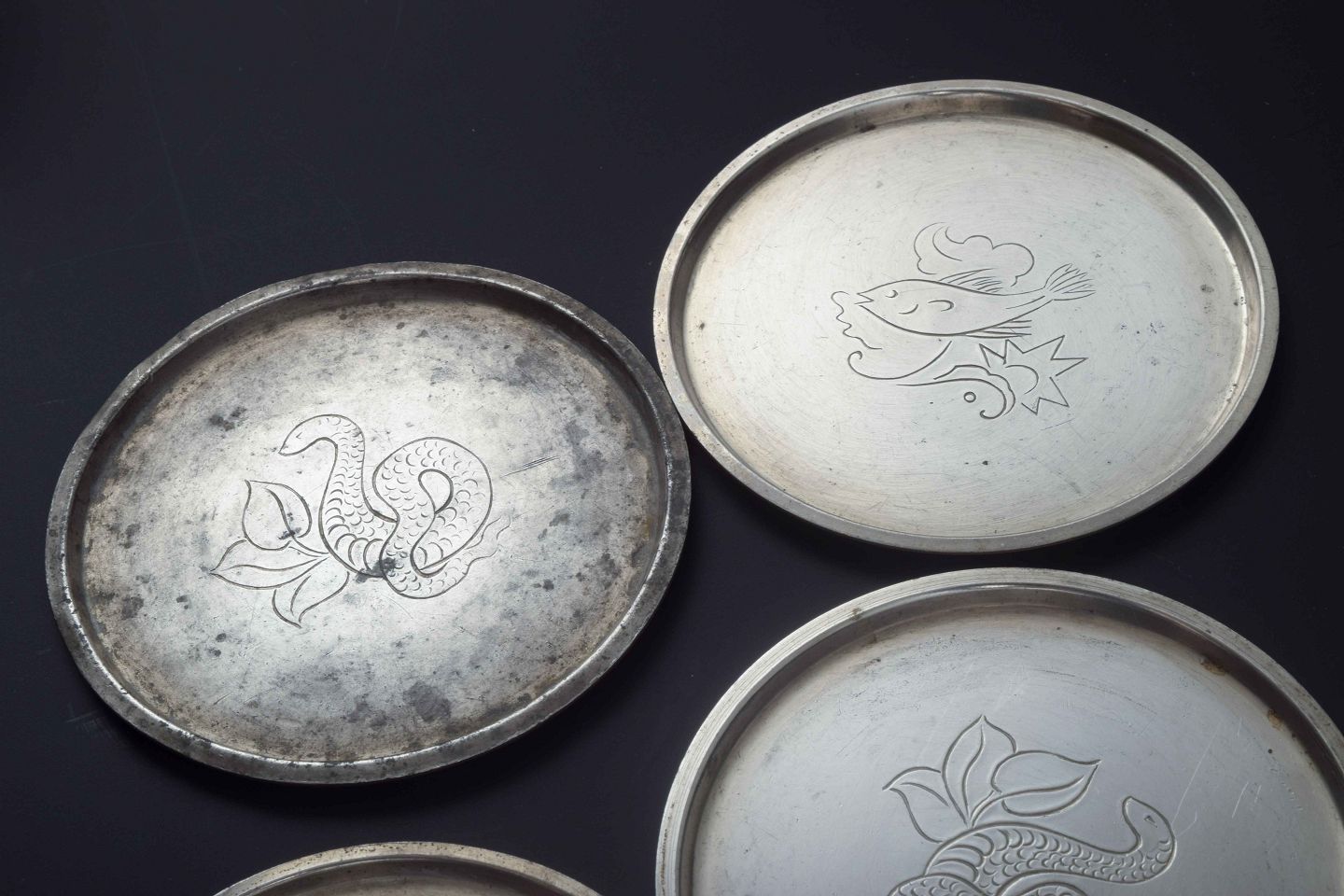 Sæt på syv flaskebakker i tin, indgraveret med dyremotiver – herunder blandt andet løve, slange og fugle. Klassisk rund form med let opadbuet kant.