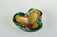 Organisk formet skål i flerfarvet glas med grønne, ravgule og rubinrøde nuancer udført i sommerso-teknik.