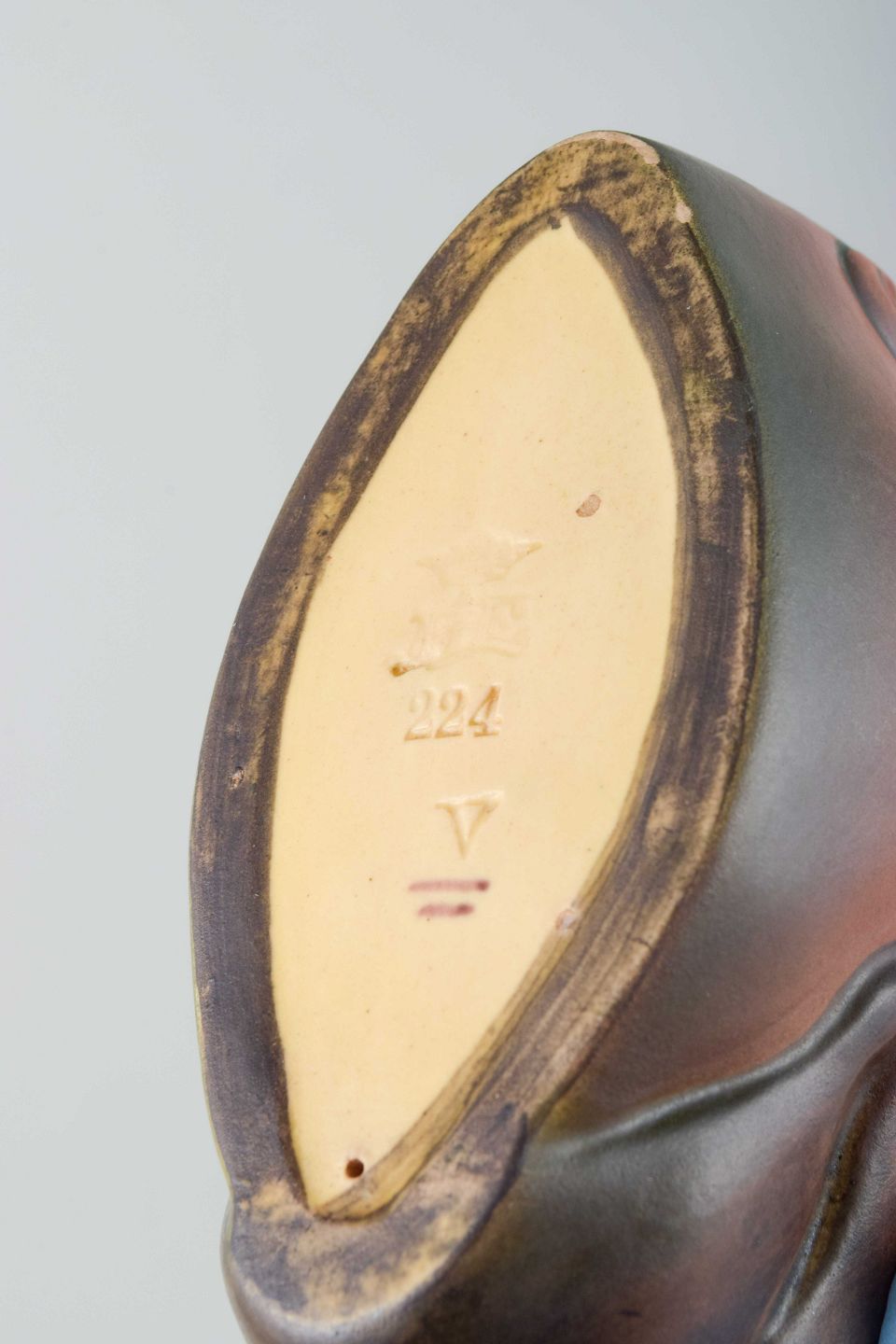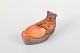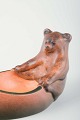 Skål med siddende bjørn i bådformet skål, glaseret keramik i brun og rødlig tone.