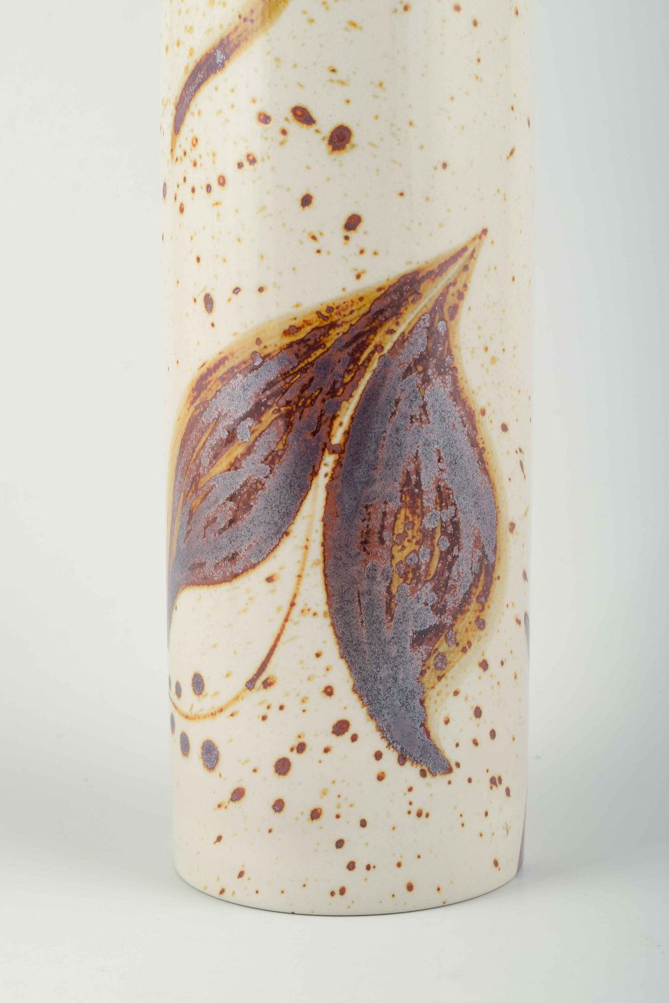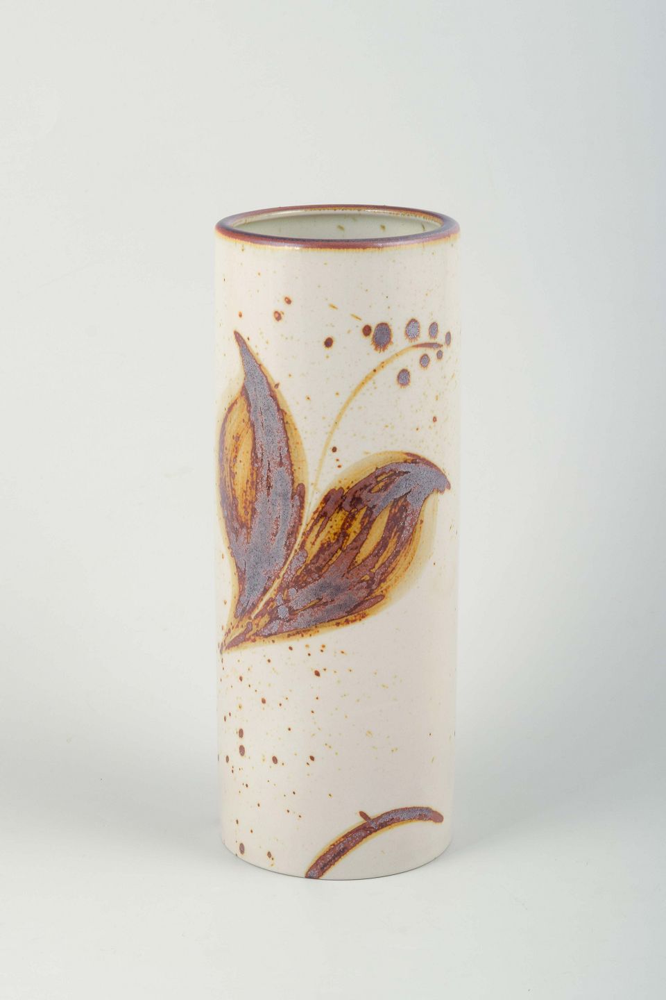 Cylinderformet vase i stentøj, dekoreret med håndmalede bladranker i brune, gule og lilla nuancer på lys bund.