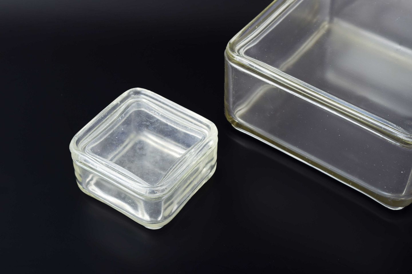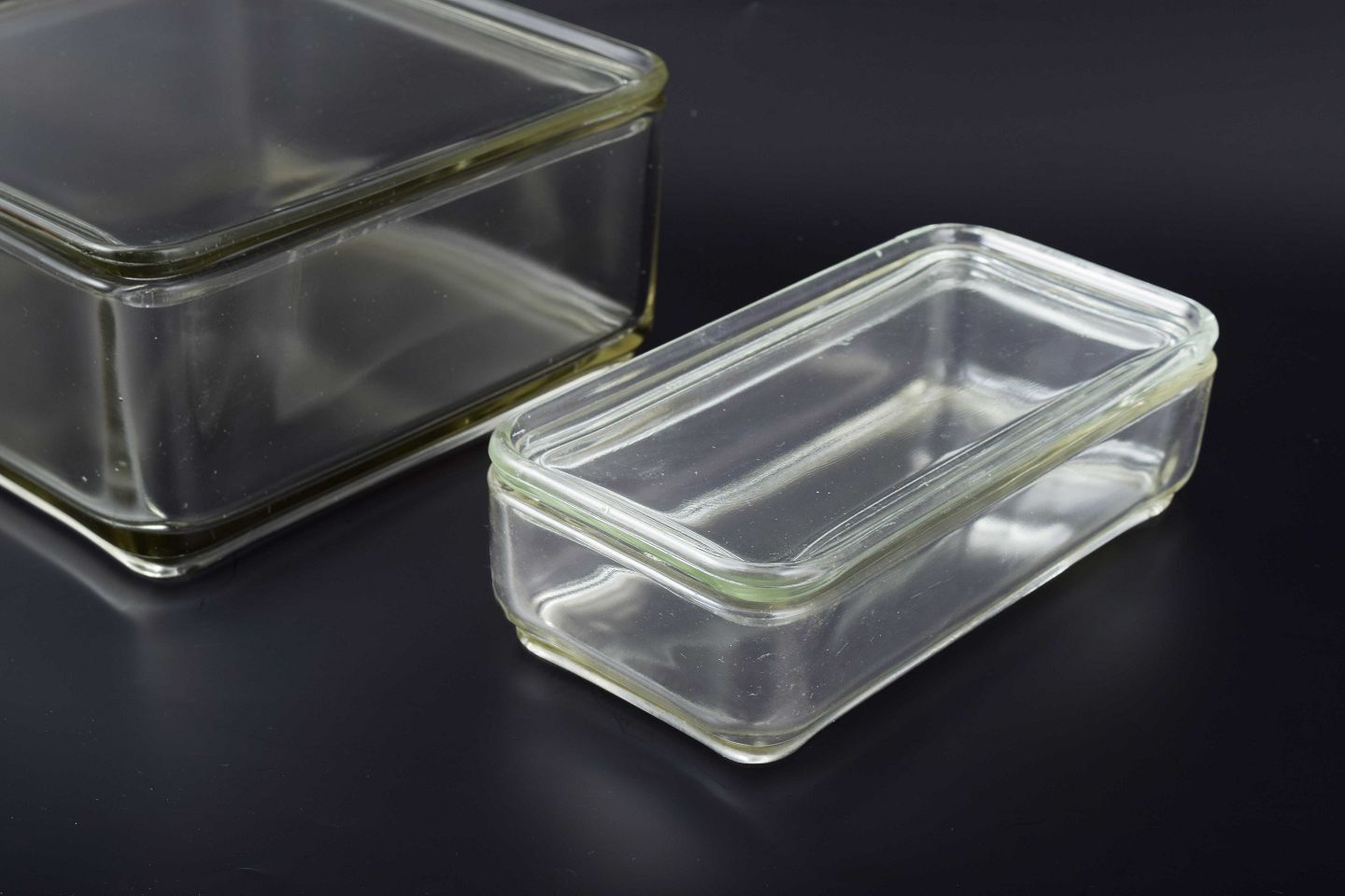 Sæt af tre rektangulære opbevaringsbokse i presset glas. Klare kasser i funktionalistisk design med afrundede hjørner og slebne kanter.