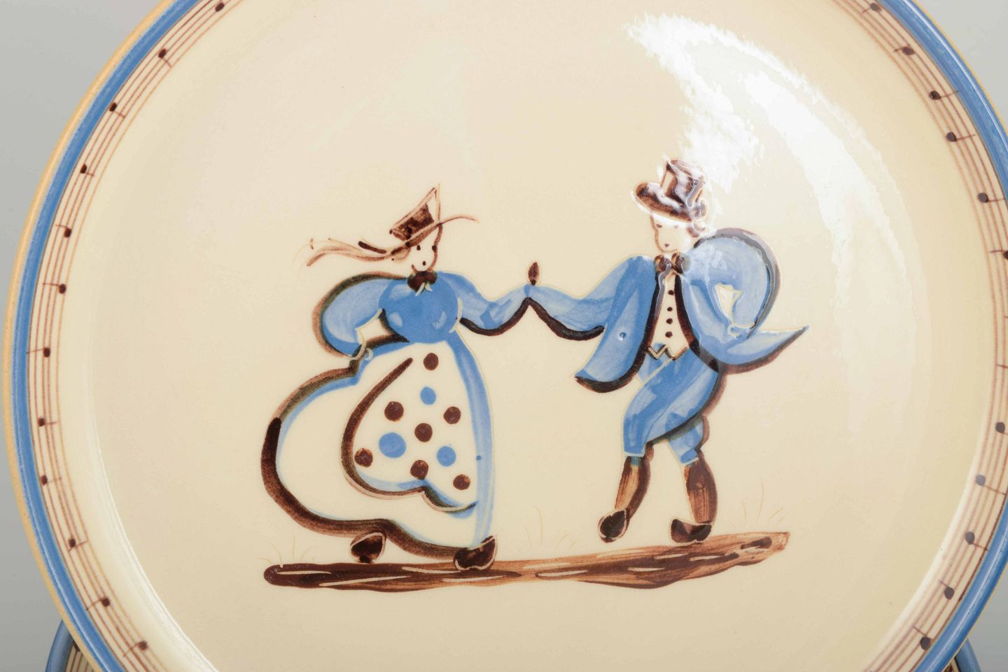 Drejet og hånddekoreret fajance med motiv af folkedansende par og musikanter i blå, brune og sorte nuancer på cremefarvet bund. Dekoreret med blå og brun kantlinje.