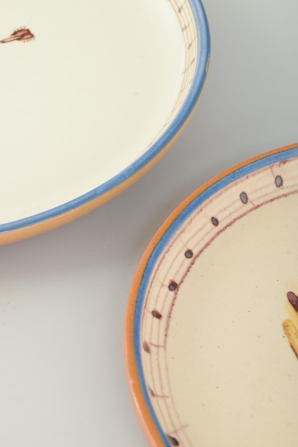 Dansk keramik fra midten af 1900-tallet er ofte præget af en legende og folkloristisk dekorationsstil, hvor motiver fra hverdagsliv og traditioner blev gengivet i en enkel, næsten naivistisk formsprog. Disse fade repræsenterer en kombination af funktionelt brugskeramik og dekorativ kunsthåndværk, som i dag er eftertragtet af samlere for deres tidstypiske udtryk og kulturhistoriske værdi.
