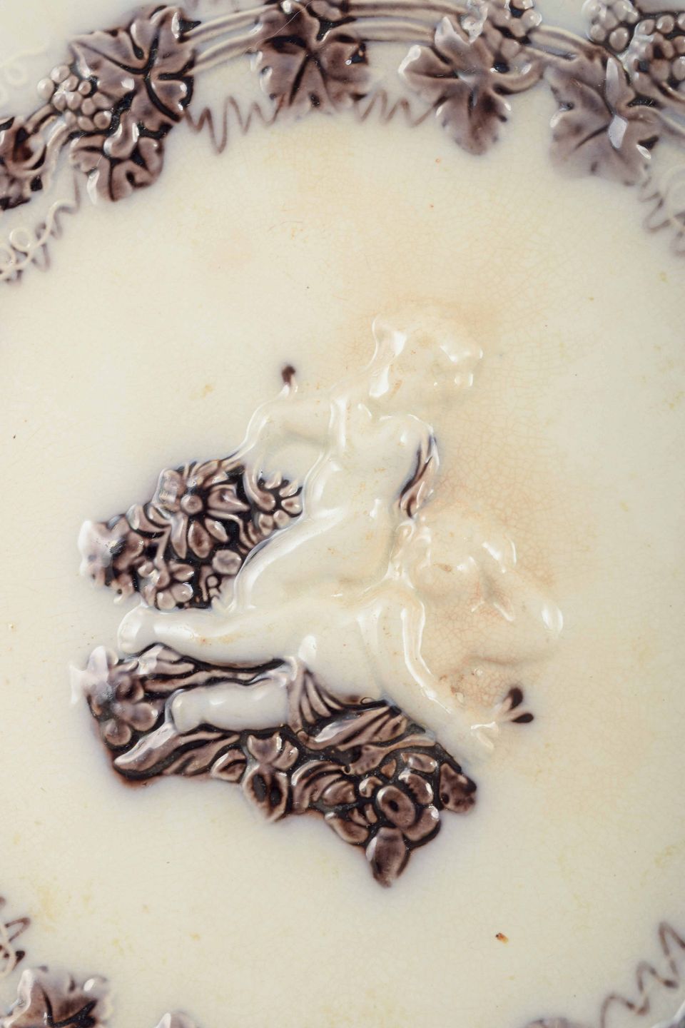 Rundt fajancefad med reliefdekor og transfertrykt vinrankemotiv i brunlig tone, centralt dekoreret med putti-figurer (små engle).