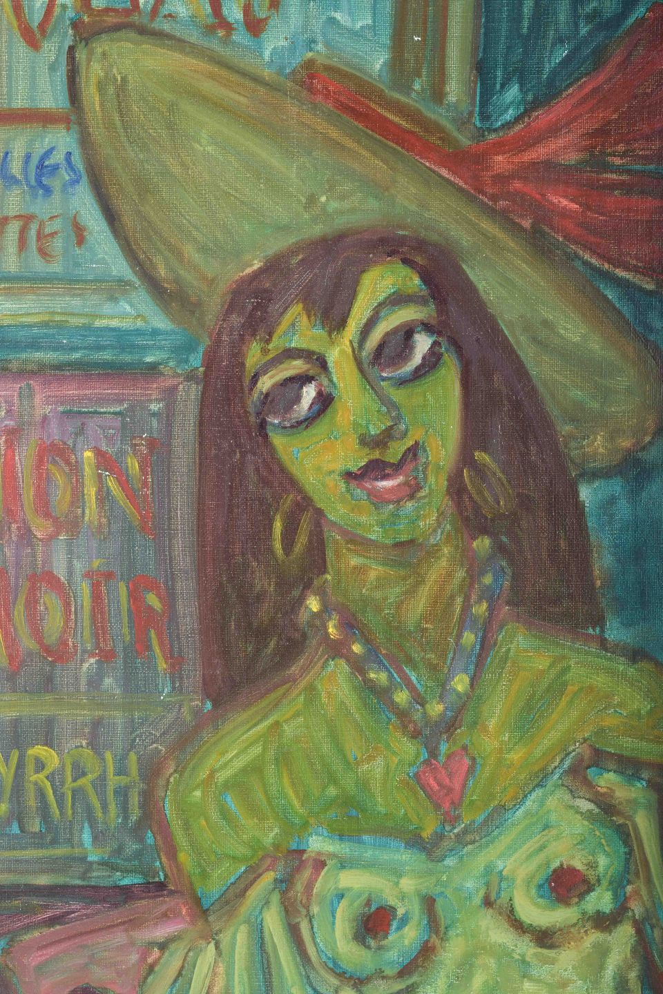 Et ekspressivt og farvestærkt maleri af Erik Larsen, hvor en kvinde i grønne nuancer, iført hat og smykker, er placeret foran en barbaggrund med reklameskilte. Maleriet emmer af pariserstemning fra midten af 1900-tallet, præget af stærke farvekontraster og en karakteristisk figurativ stil.