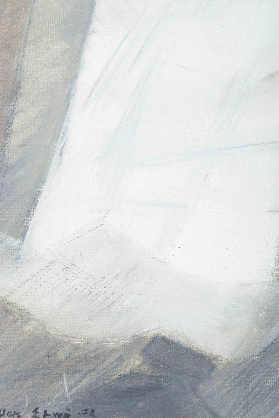 Et stemningsfuldt og afdæmpet maleri i grå og hvide nuancer, hvor geometriske og abstrakte former smelter sammen i en komposition, der både virker stringent og drømmende. Værket fremstår med et minimalistisk udtryk, hvor lysets spil i de hvide felter kontrasteres af de mørkere, skyggefulde partier.