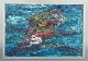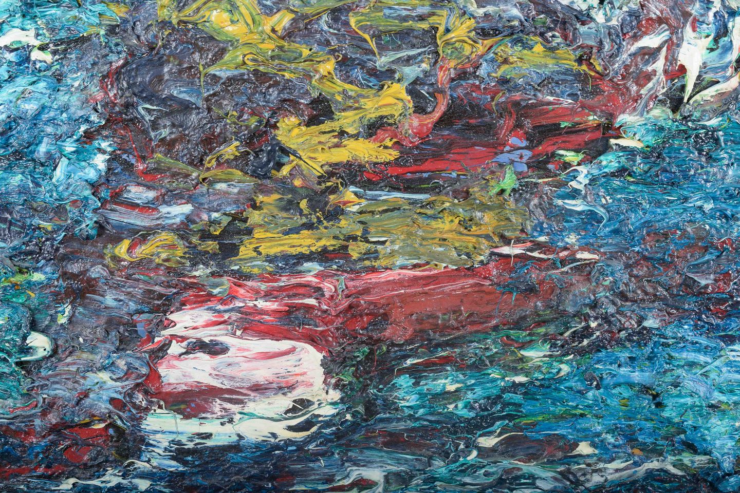Et ekspressivt, koloristisk maleri udført med kraftige, pastose strøg i blå, røde, gule og hvide nuancer. Værket fremstår som en struktureret, men fri abstrakt flade, hvor farverne danner en dynamisk og levende komposition.