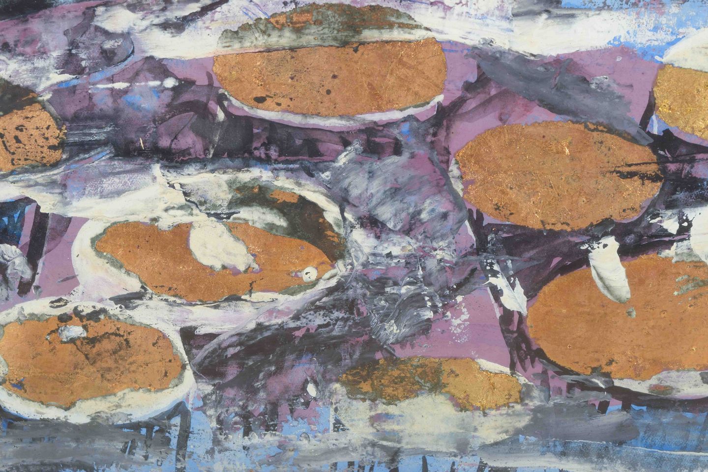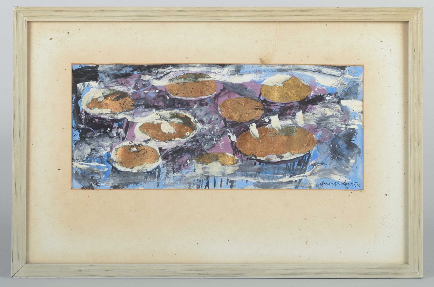 Et ekspressivt, lyrisk værk af Bengt Nordquist, hvor gyldne former svæver mod en blåviolet baggrund i en dynamisk komposition. Signeret og dateret “Bengt Nordquist ’66” nederst til højre.