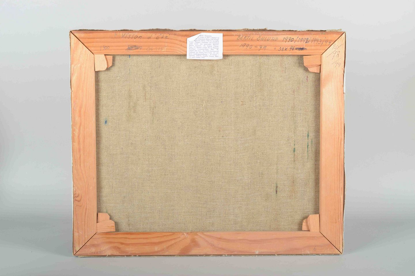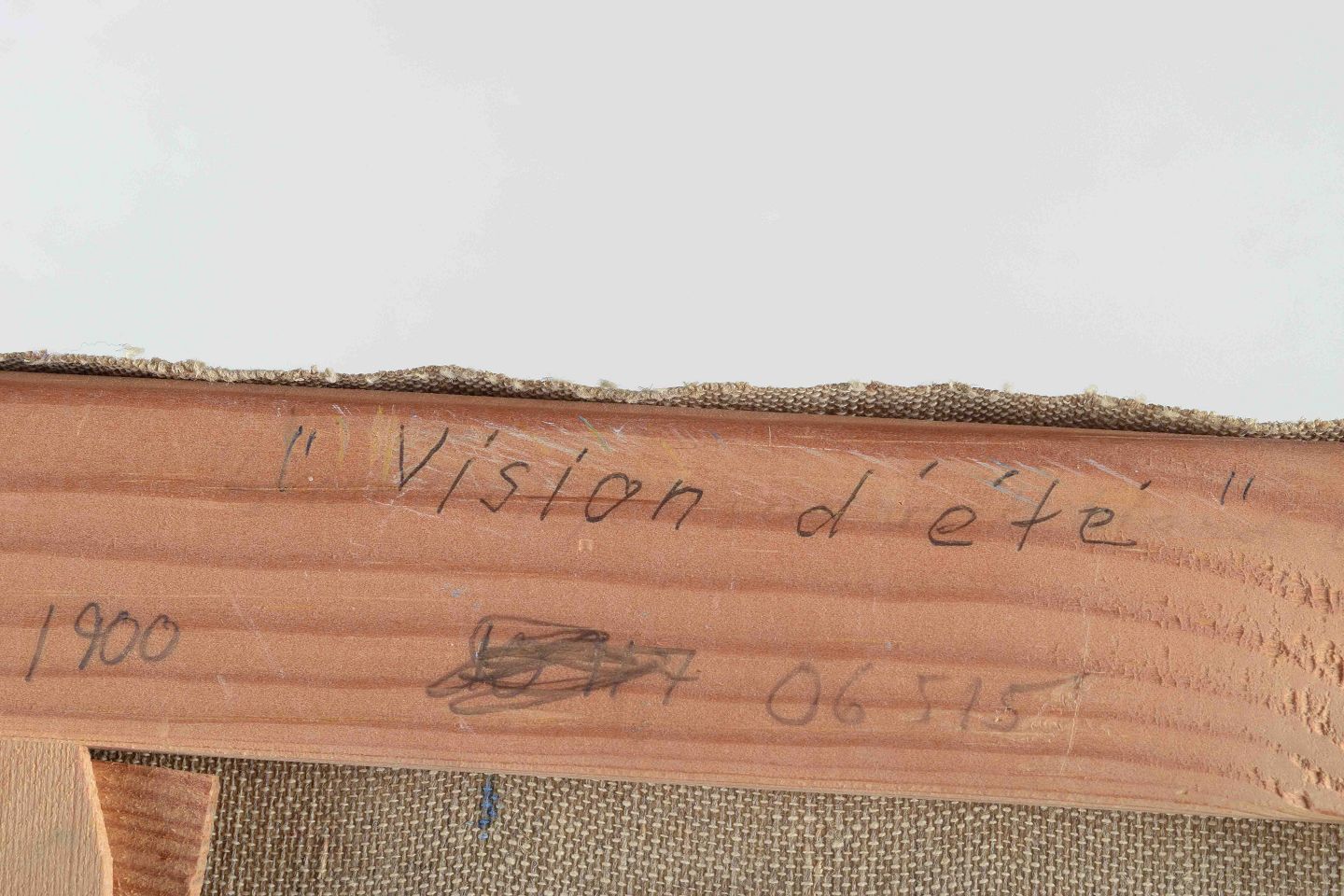 Et lyrisk, koloristisk maleri i pointillistisk præg med varme gyldne, hvide og blå nuancer. Værket har en meditativ karakter og indfanger sommerens lys i et abstrakt formsprog.