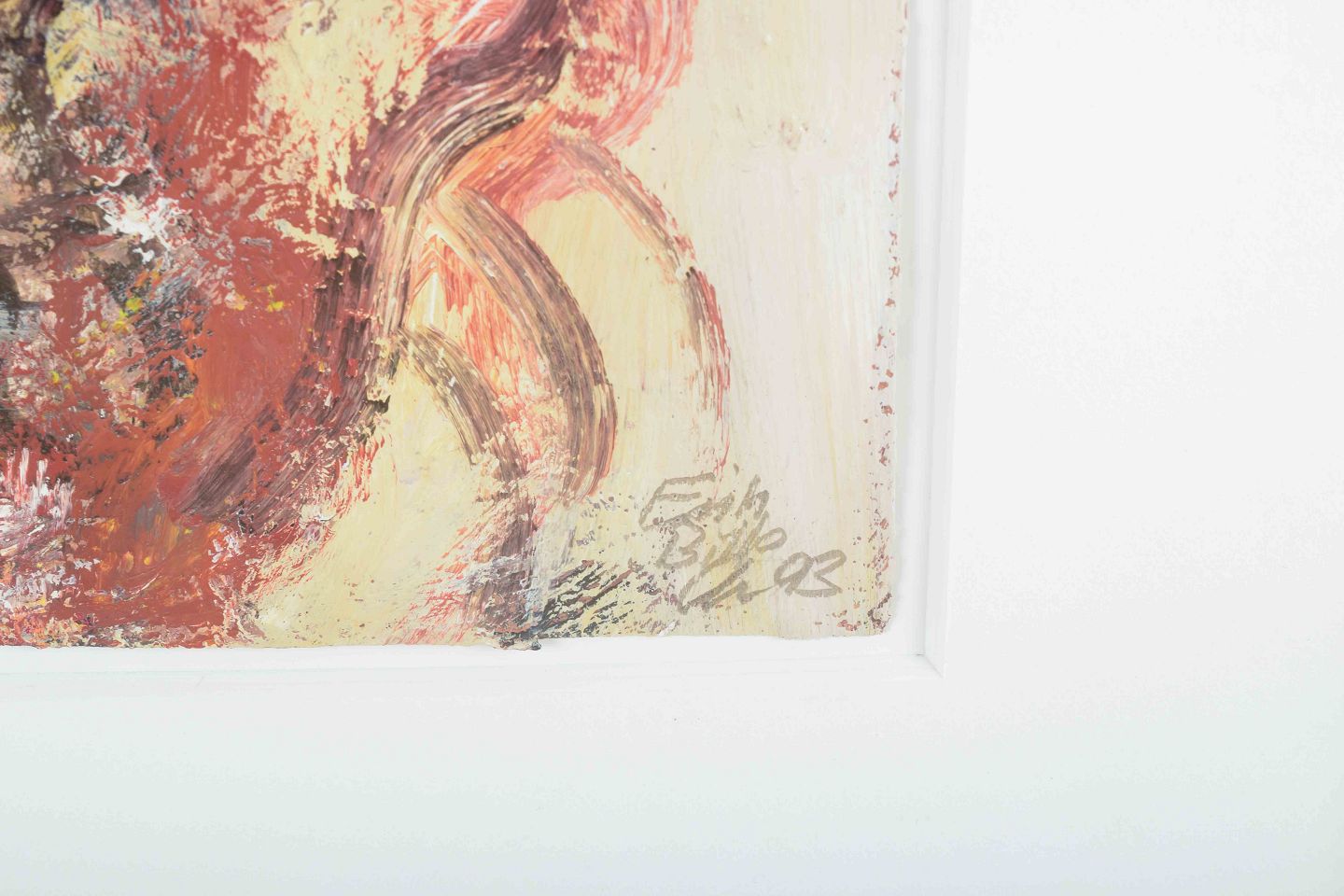 Et ekspressivt maleri af Erik Bille Christiansen udført i 1993. Kompositionen er præget af kraftige penselstrøg og et varmt farvespil i røde, sorte og jordfarvede nuancer, hvor figurative elementer antydes i en ellers abstrakt billedverden.