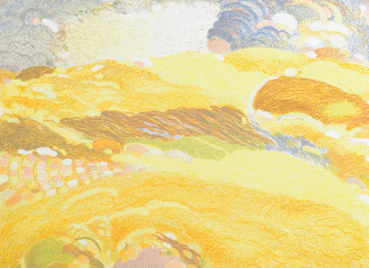 Abstrakt farvelitografi med organiske og bølgende former i gule og gyldne nuancer, der danner et stemningsfuldt landskab.