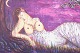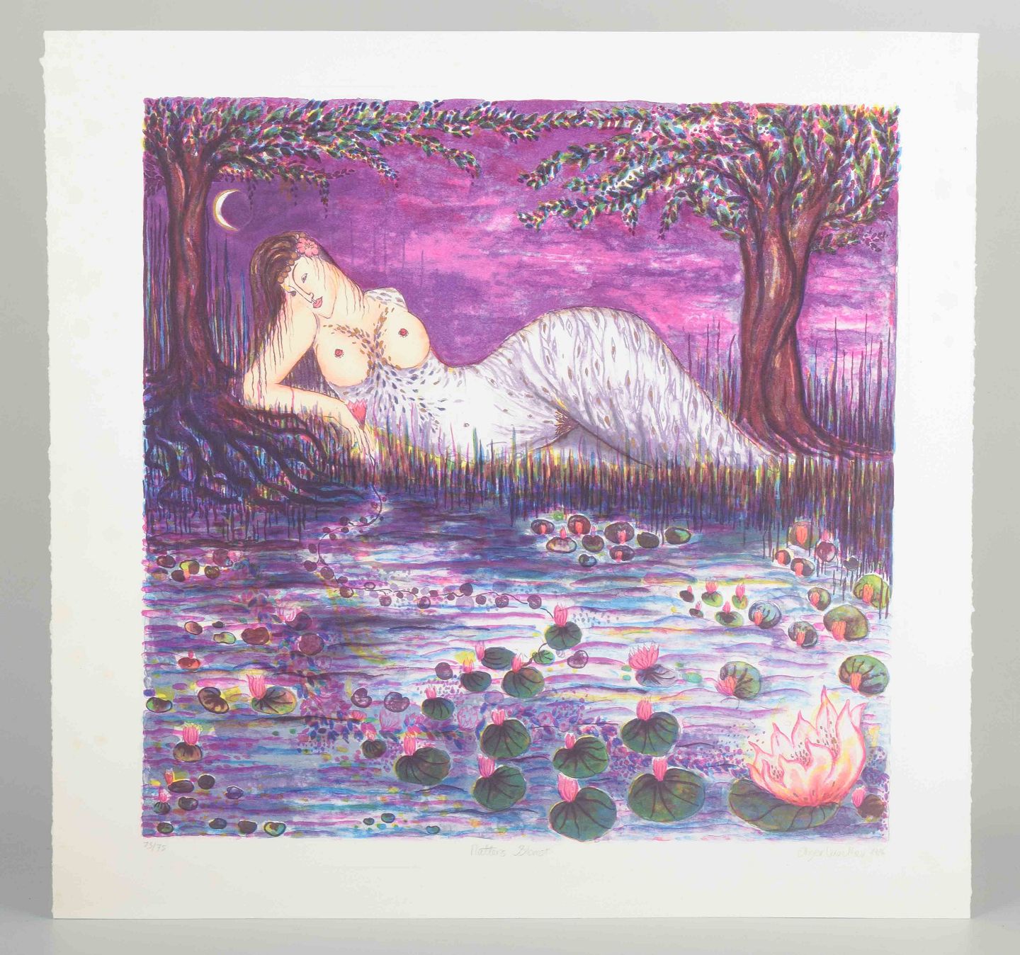 Et stemningsfuldt og farverigt værk, hvor en kvindelig figur ligger under nattehimlen omgivet af åkander og blomster i et drømmeagtigt landskab. Værket er præget af Winthers karakteristiske organiske former og sanselige billedsprog.
