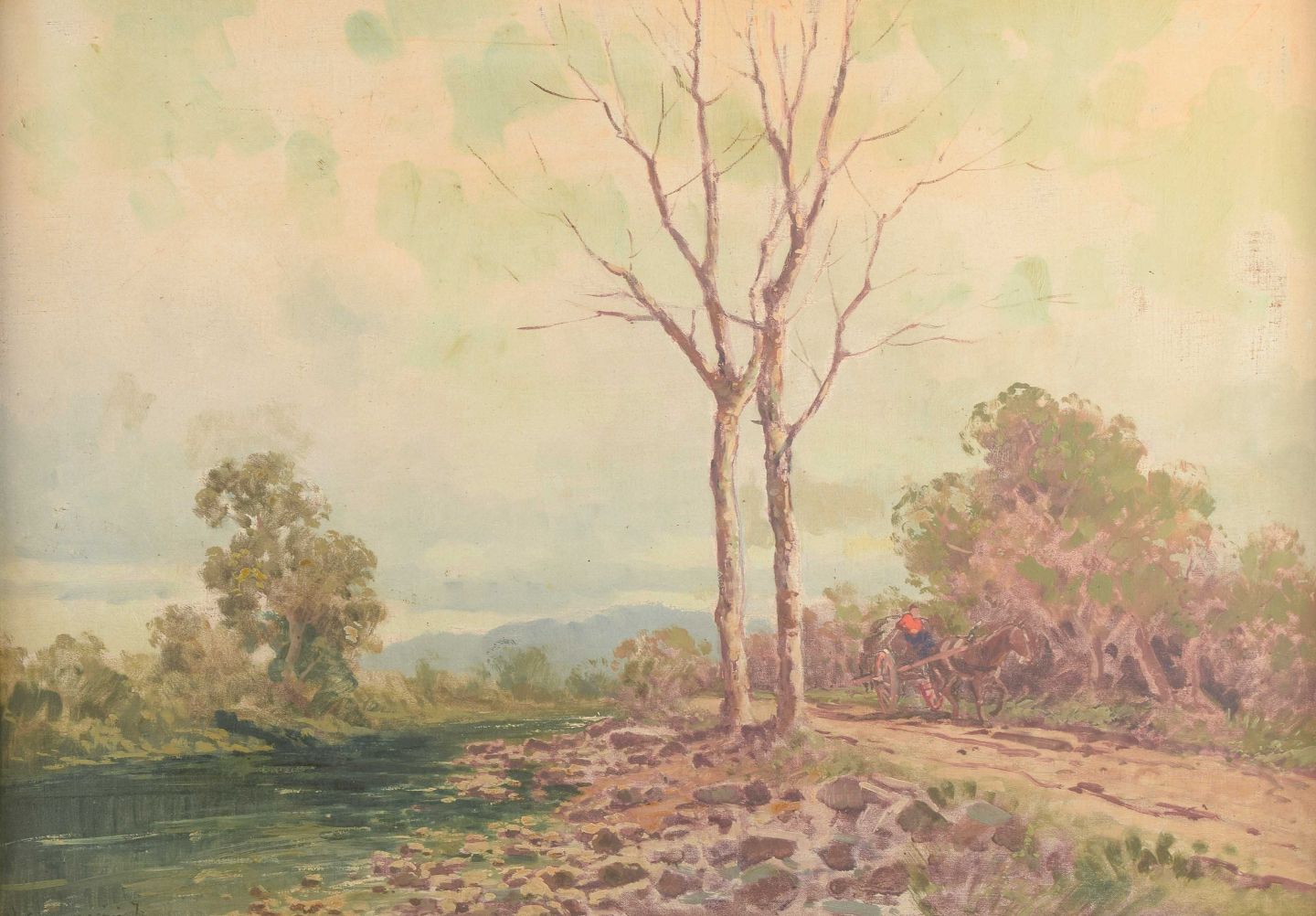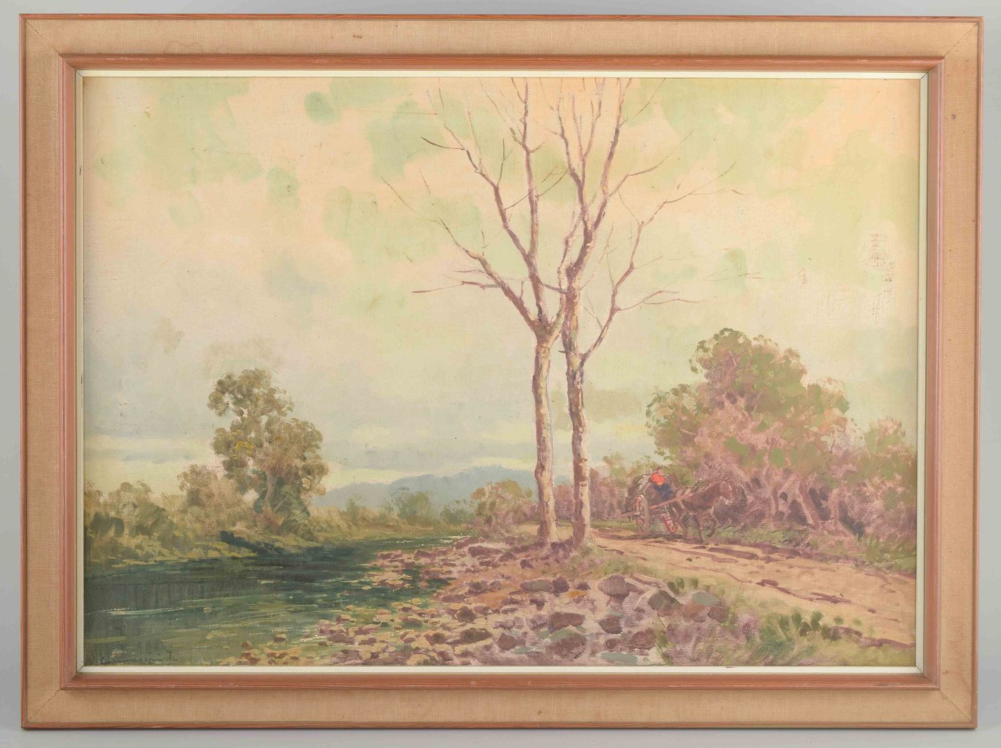 Stemningsfuldt landskabsmaleri med et åbent landskab, hvor en vej bugter sig langs en række træer med en vogndriver i rødt synlig i baggrunden. Det bløde farvevalg og de lyse grønne, rosa og blå toner skaber en rolig atmosfære, karakteristisk for Giannaccinis naturskildringer.