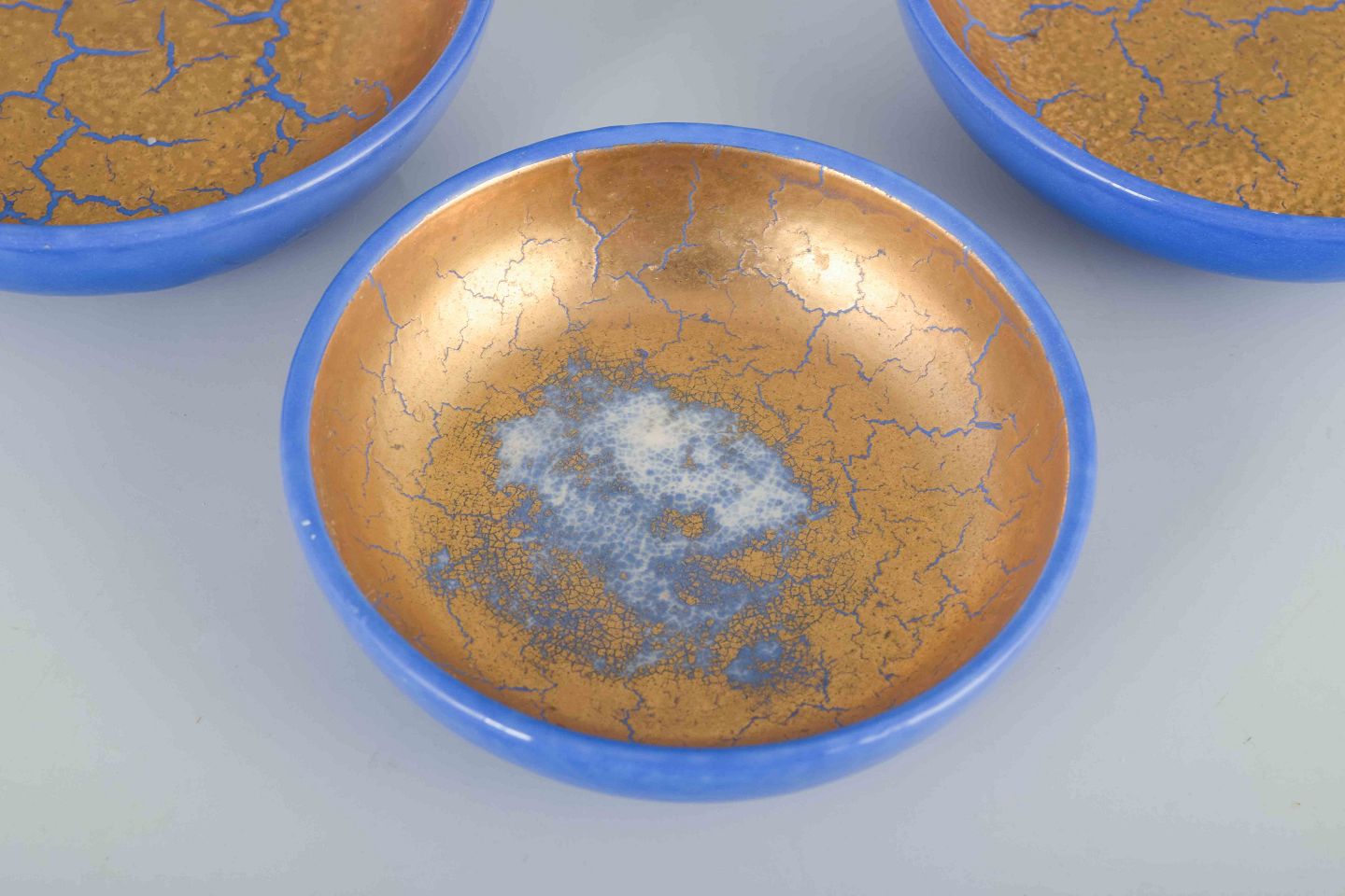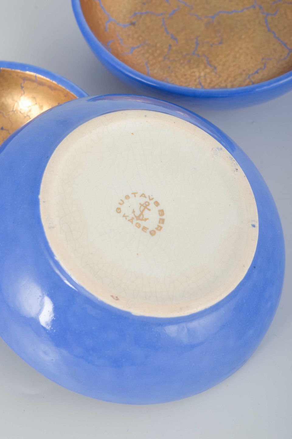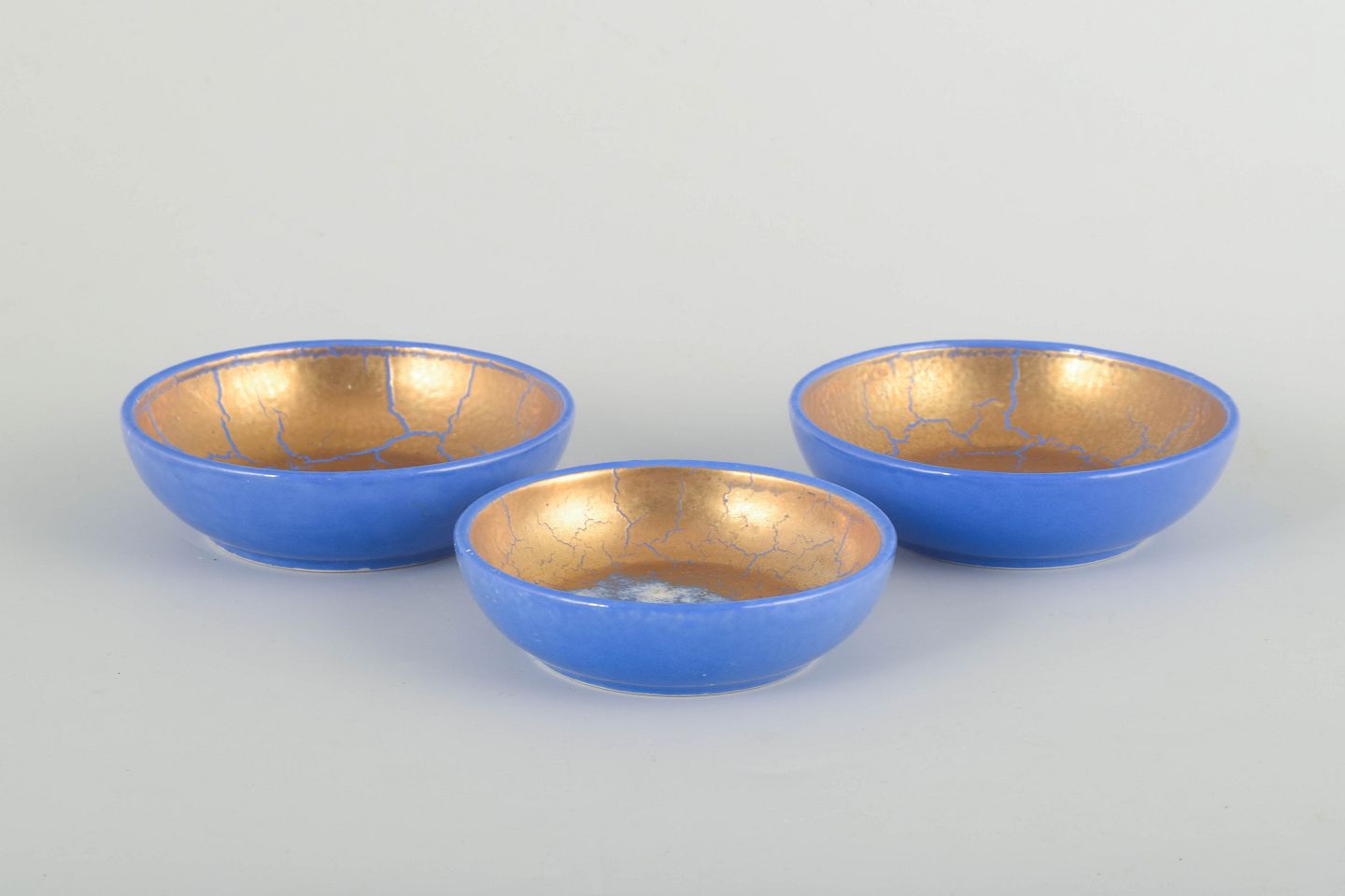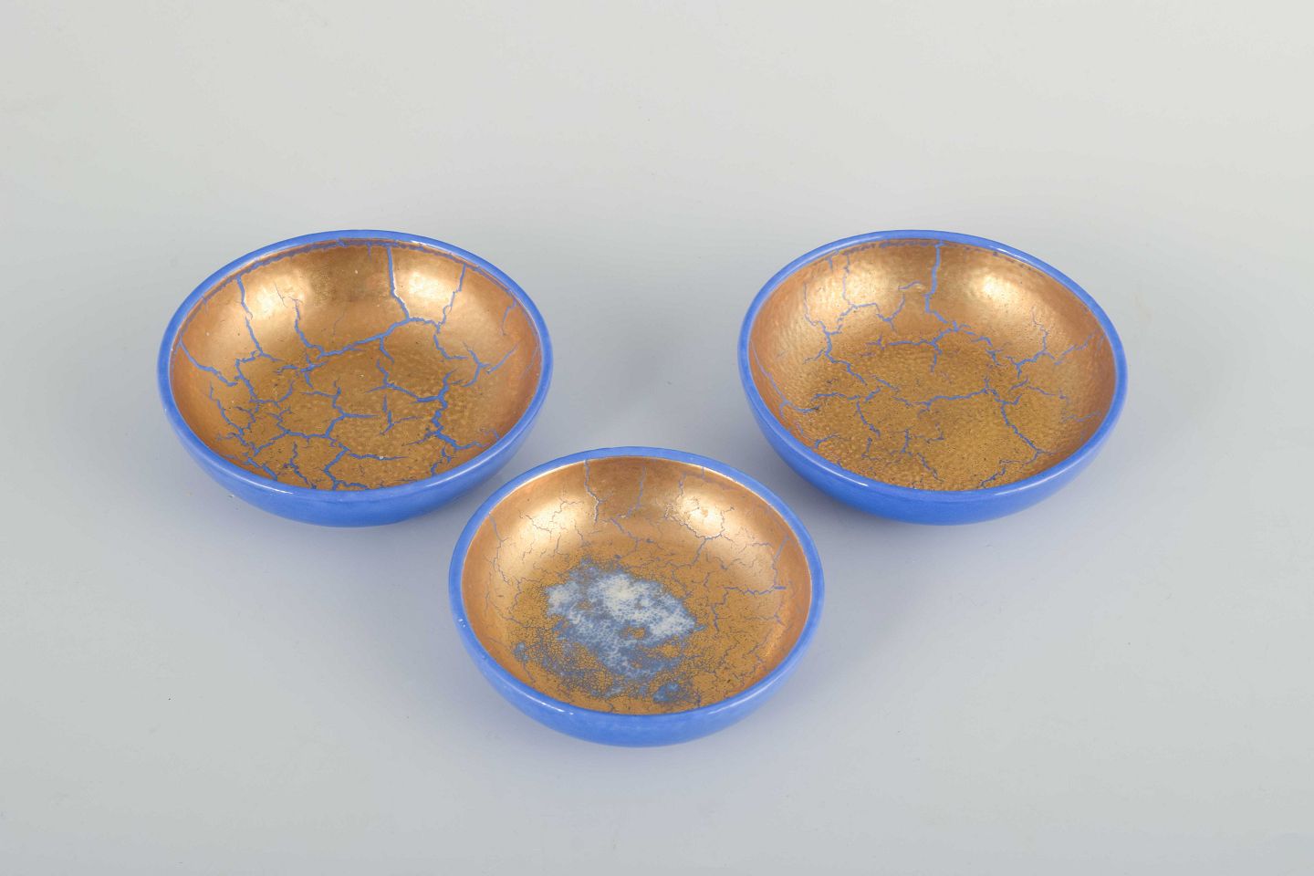 Sæt med tre lave skåle i fajance med udvendig blå glasur og indvendig metallisk guldglasur med krakelering.