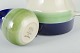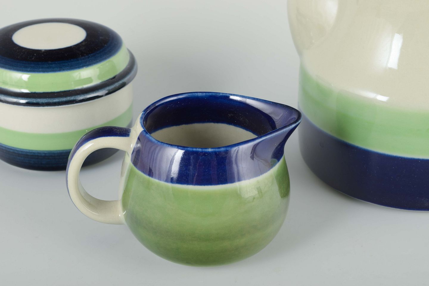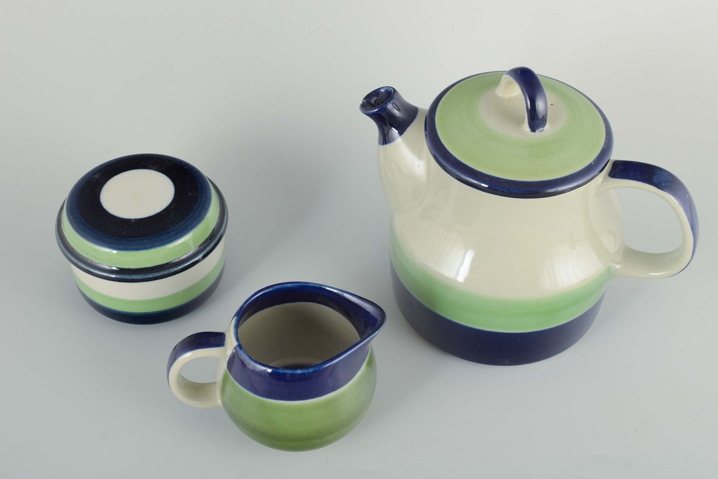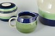 Sæt bestående af kaffekande, sukkerskål og flødekande i fajance med hvid glasur, grøn og blå dekoration.