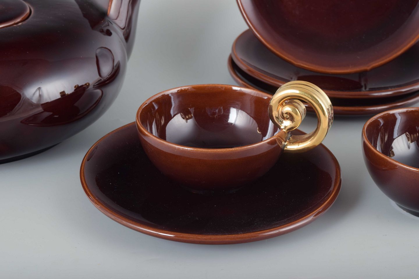 Tesæt i glaseret keramik i dyb bordeaux farve med karakteristiske hanke i forgyldt keramik. Bestående af tekande, fire kopper med underkopper samt fire tallerkener.