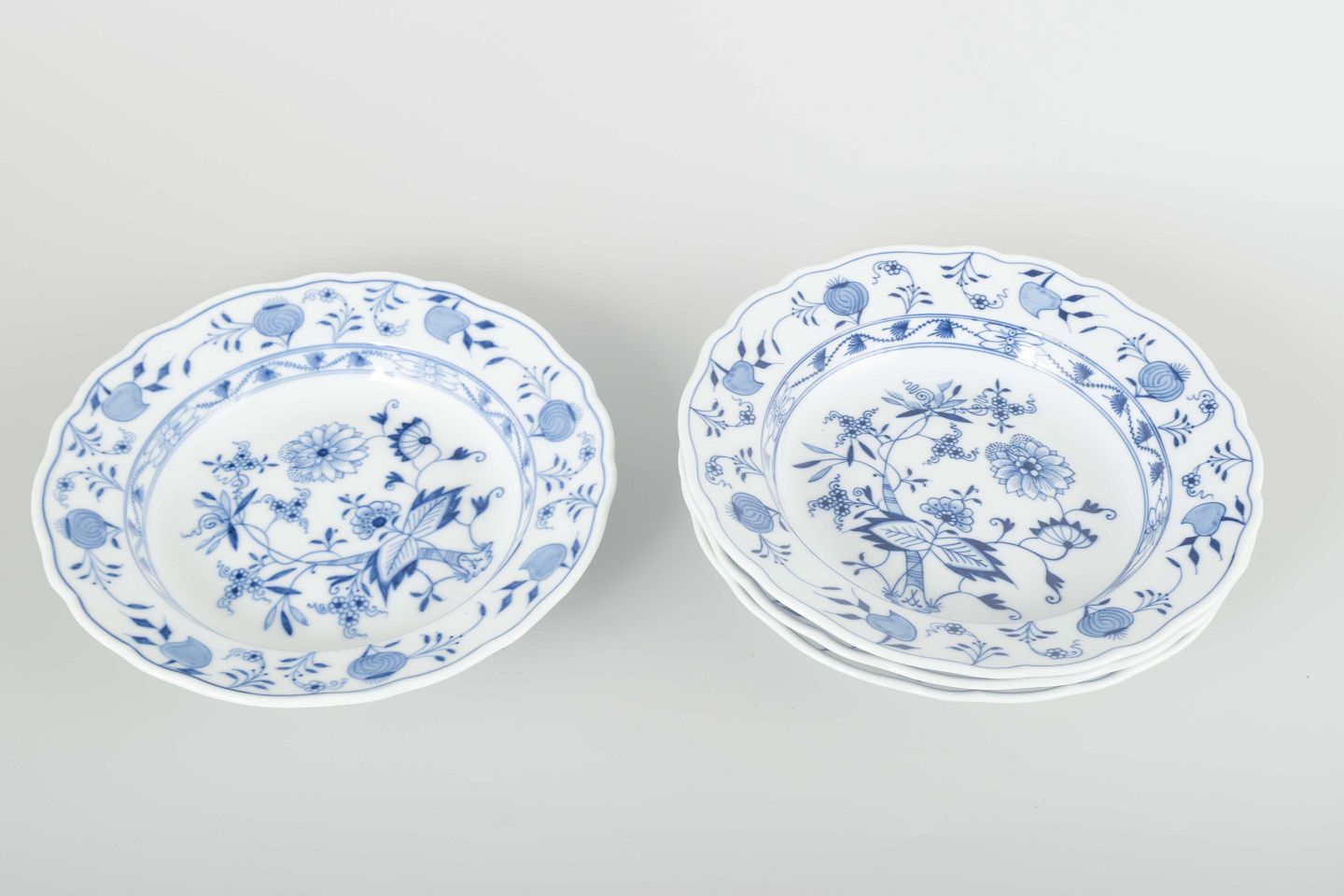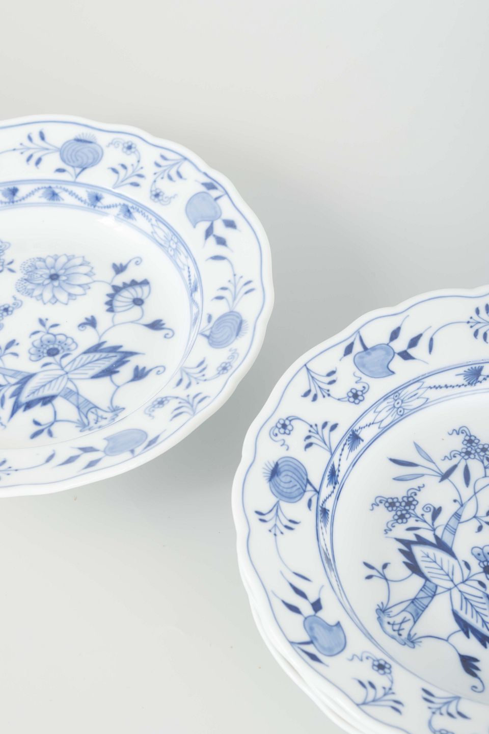 Fire håndmalede dybe porcelænstallerkener i det klassiske “Løgmønstret” (Blue Onion) mønster. Dekoreret i underglasurblå med bølget kant og elegant ornamentik.