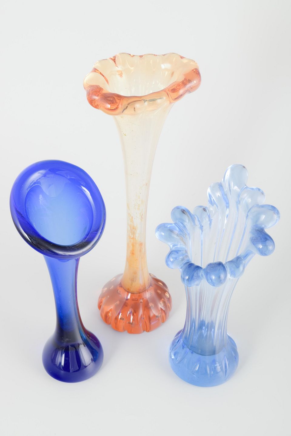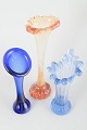 Organisk formede glasvaser i blå og rosa nuancer med karakteristiske bløde, frie former. Typisk for den svenske studioglasproduktion i 1970’erne, hvor farve og form blev brugt eksperimenterende og skulpturelt.