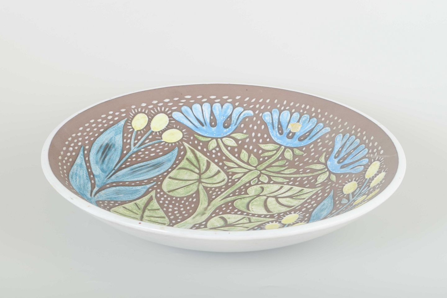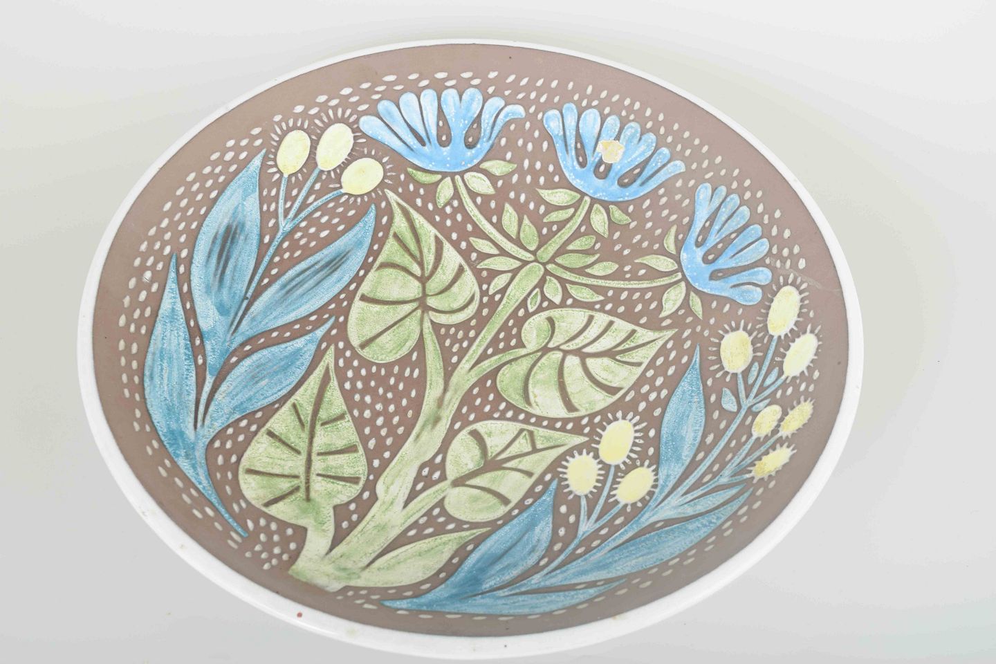 Dekorativt fad i glaseret keramik med reliefmønster af blomster i blå, grønne og hvide nuancer mod brun baggrund.
