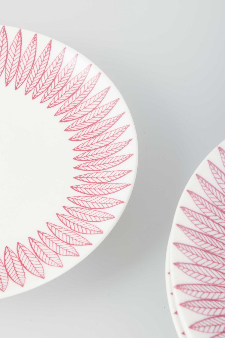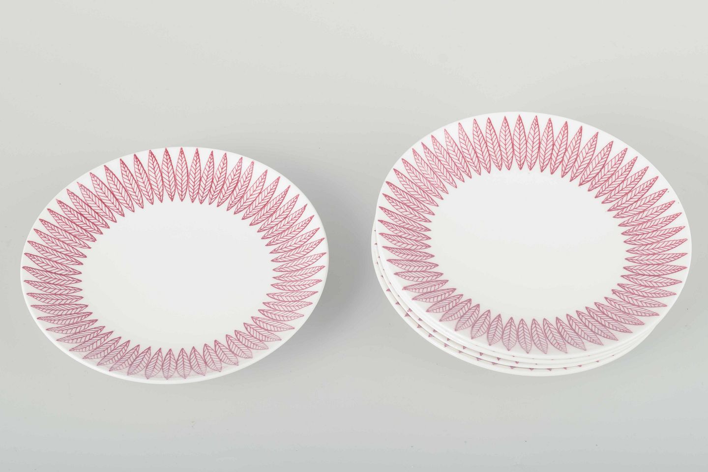 Sæt på seks kagetallerkener i fajance med det karakteristiske “Salix”-mønster i rosa på hvid bund, designet af Stig Lindberg.