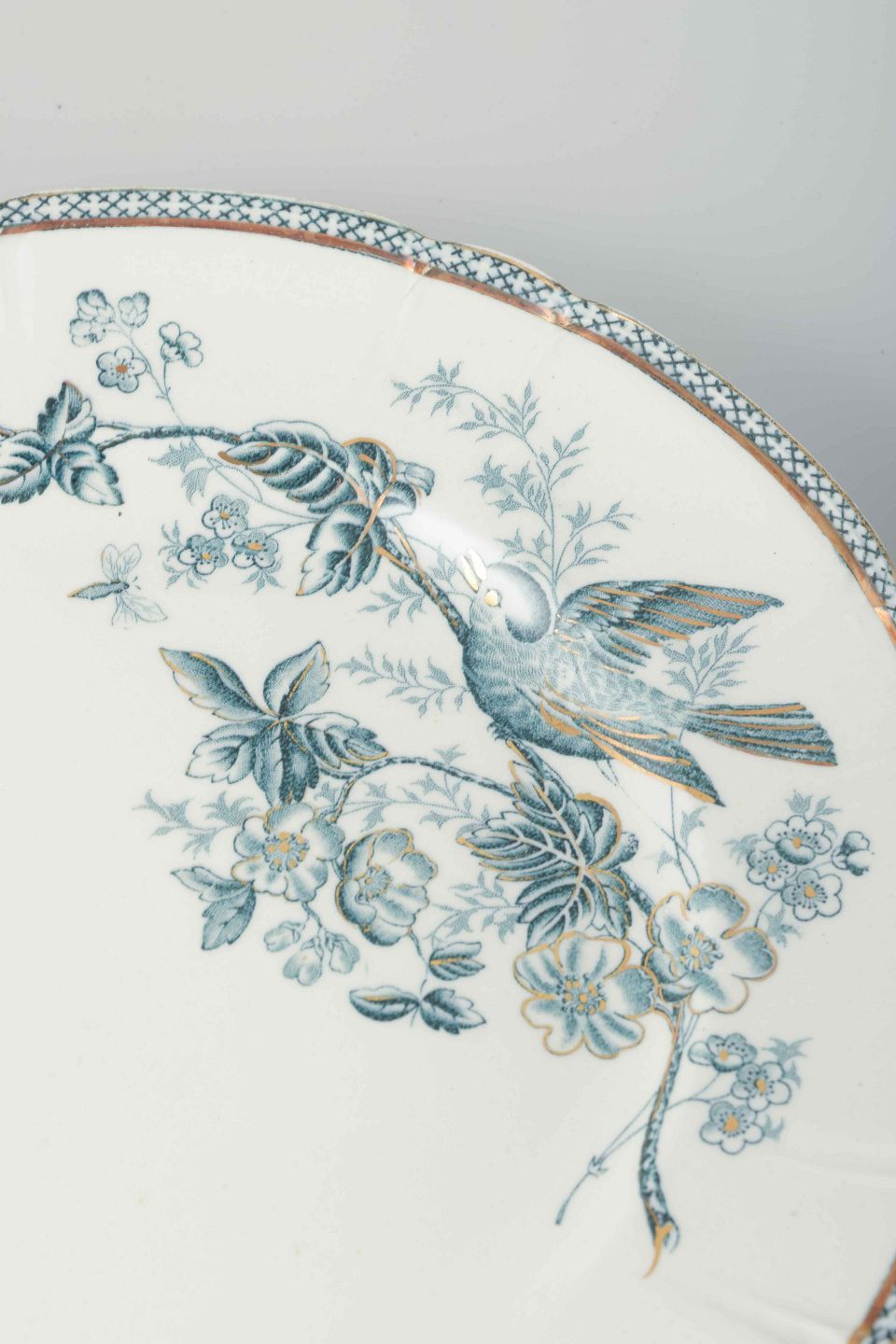 Seks frokosttallerkener i fajance med dekoration af fugl og blomstergren i blågrønne nuancer samt dekorativ bort langs kanten.