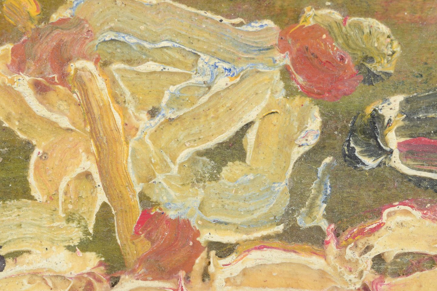 A non-figurative, expressive work executed with thick palette-knife strokes in light ochre, beige and rose tones on a muted green-brown ground. The composition appears gestural and almost topographical — recalling an organic, bodily landscape in motion. Typical of Swedish post-war abstraction focused on painterly surface and materiality.