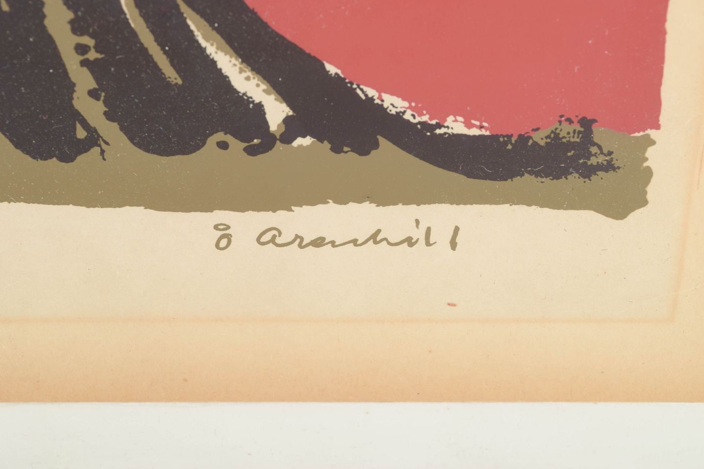 Abstrakt komposition med stiliserede kosmiske figurer og grafiske former i røde, gyldne og sorte toner, typisk for Arenhills poetiske billedsprog med inspiration fra teater, musik og drømmesekvenser.