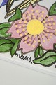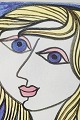 Rektangulært modelleret keramikfad med håndmalet, stiliseret kvindeportræt i modernistisk formsprog og blomstermotiv. Model 4033.