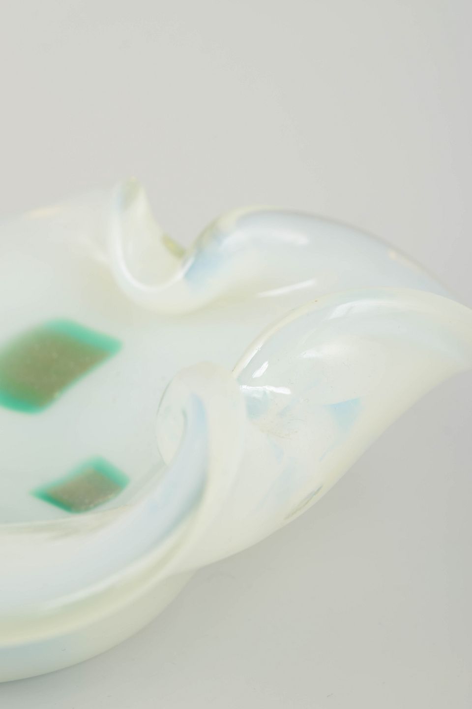 Organisk formet art glass-skål i håndblæst glas med iriserende overflade i opalhvide og grønne nuancer. Den bølgende form og de indsmeltede farvefelter giver skålen et karakteristisk udtryk, typisk for Murano-glas fra perioden.