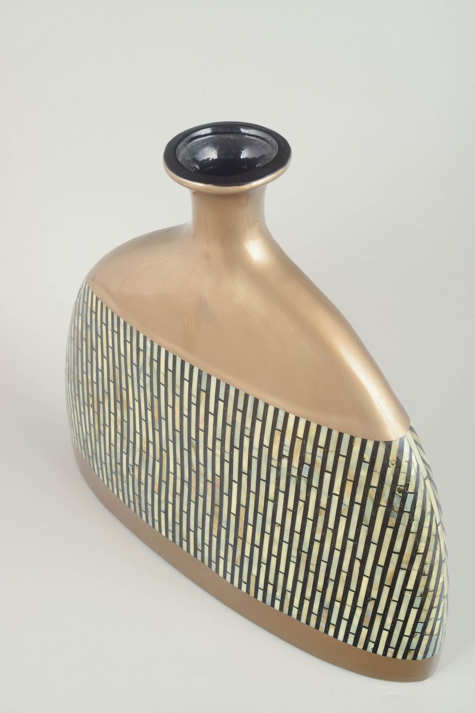 Imponerende, skulpturel studiovase i glaseret keramik med geometrisk mosaikdekoration i metalliske og lyse toner. Den brede, asymmetriske form og den reflekterende glasur giver vasen et markant, dekorativt udtryk typisk for 1980’ernes europæiske studiokeramik.