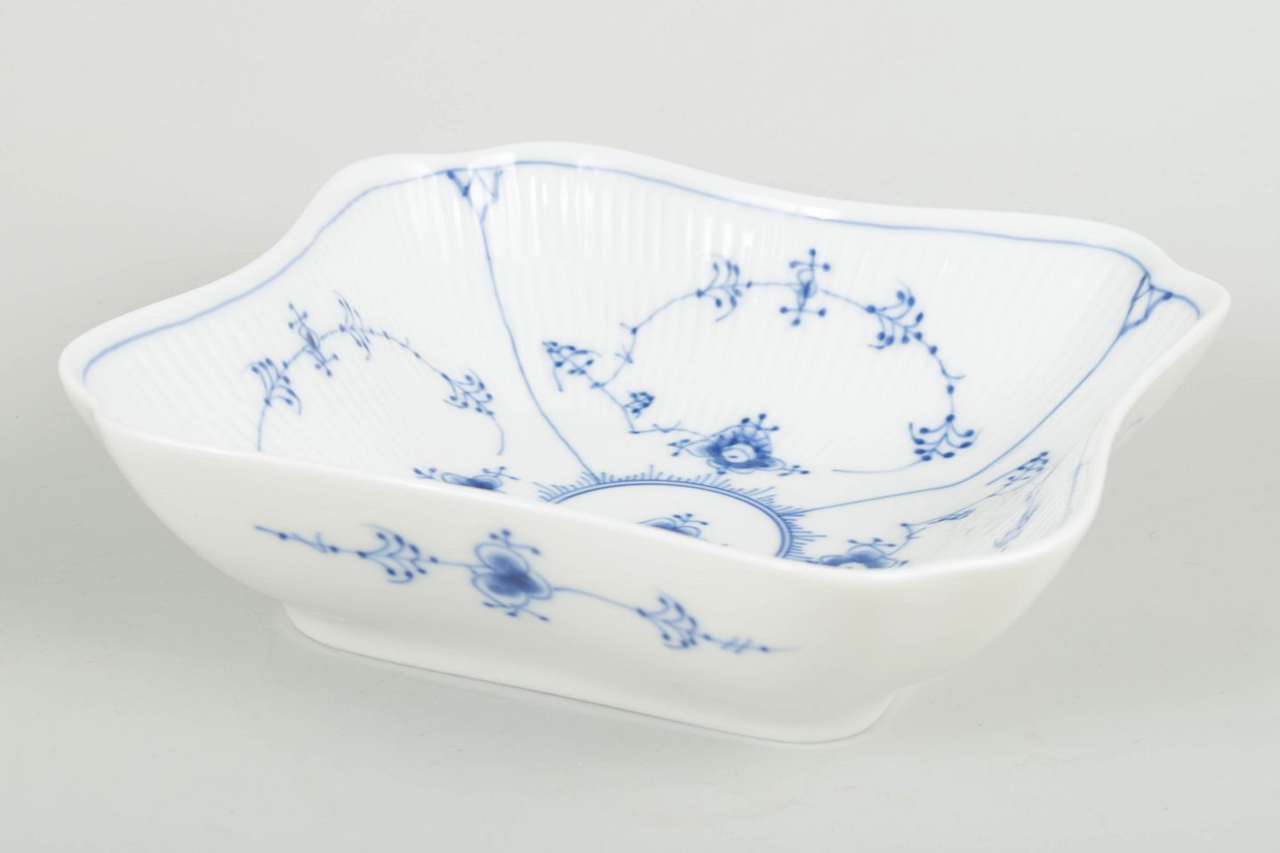 Elegant squared bowl in the Blue Fluted Plain porcelain series with softly waved edges and hand-painted cobalt-blue decoration on a fluted body. A decorative and functional form typical of Royal Copenhagen’s late 20th-century production.