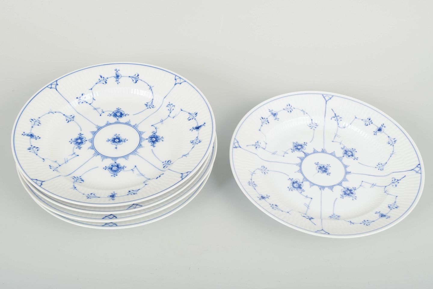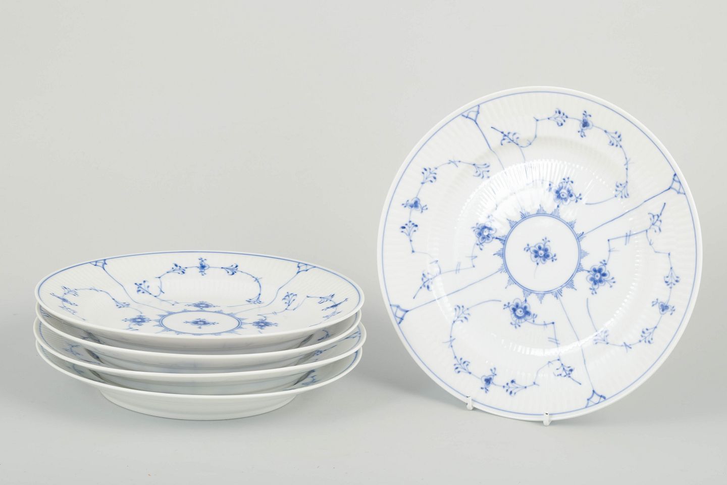 Set of five lunch plates in the classic “Blue Fluted Plain” pattern, hand-painted in cobalt blue on fluted porcelain. A quintessential Royal Copenhagen design from the 1950s.
