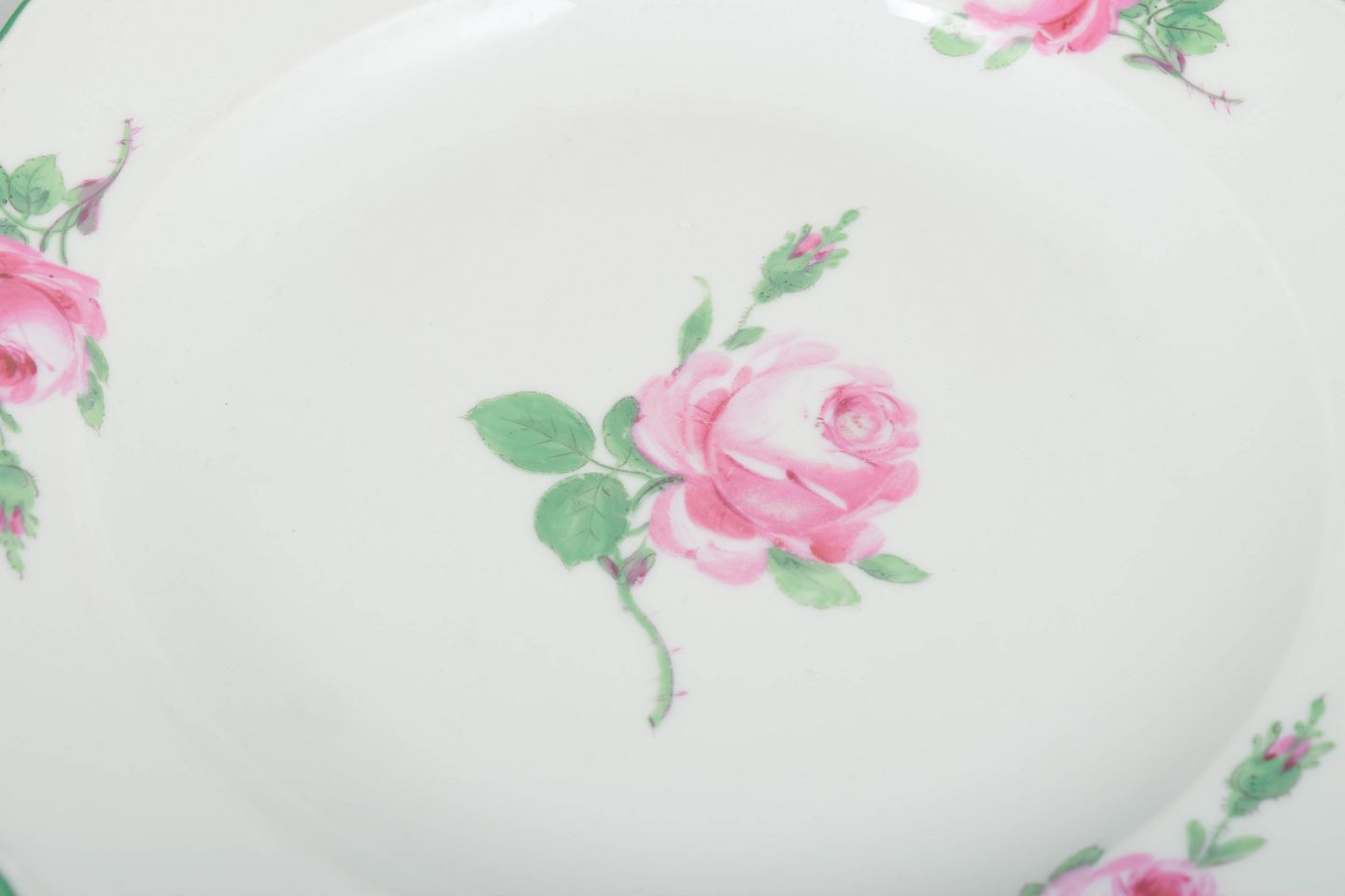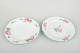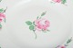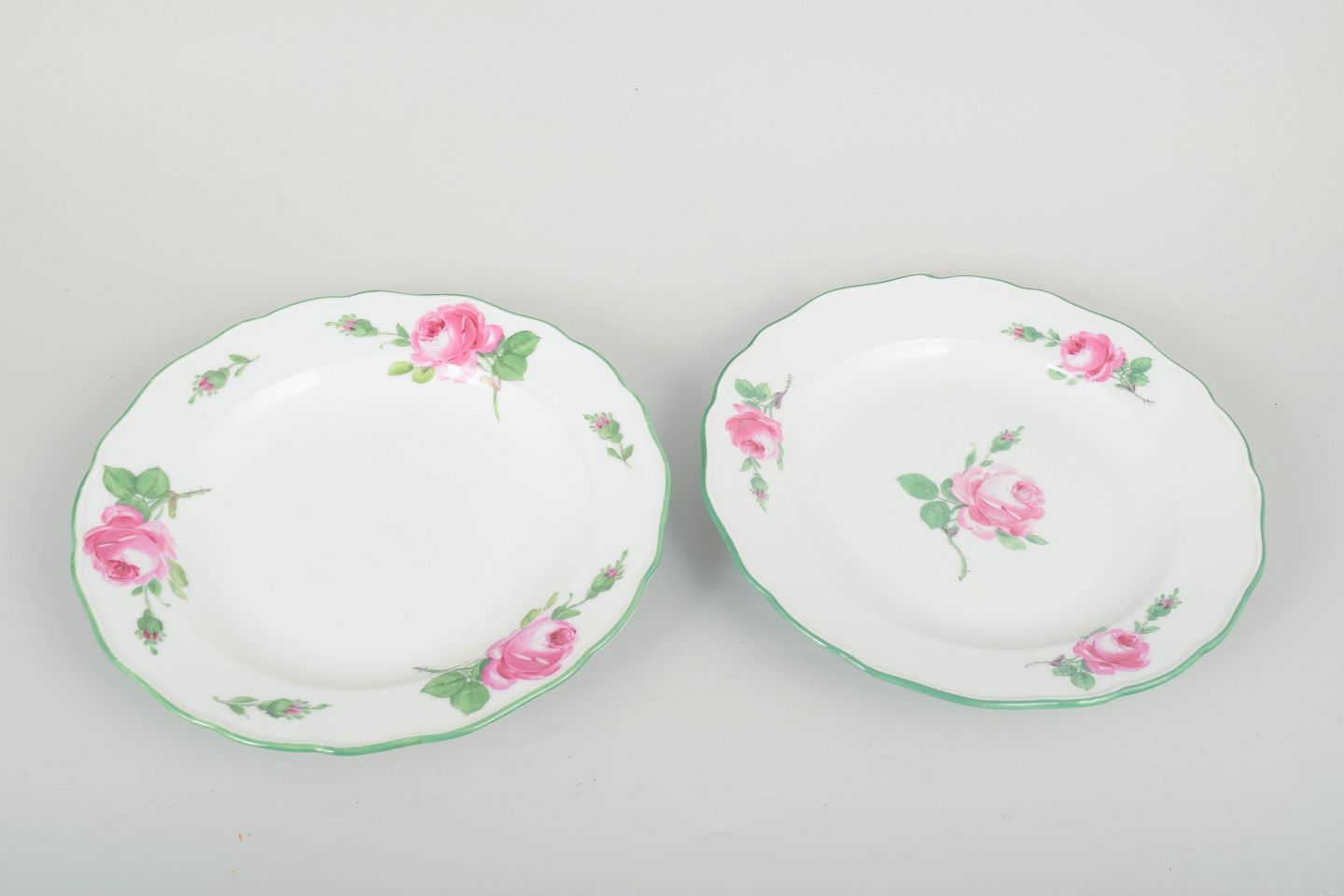 Smukke tallerkener i hvidt porcelæn med håndmalede lyserøde roser og grøn bort langs den svungne kant. Klassisk Meissen-kvalitet og elegant dekoration i tidstypisk 1930’er-stil.